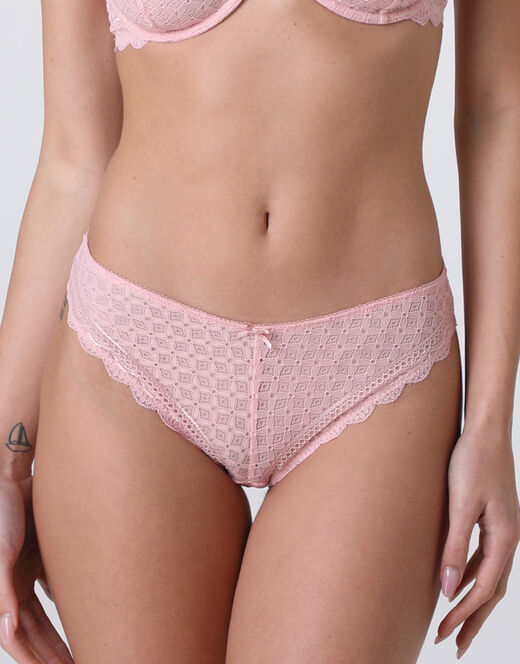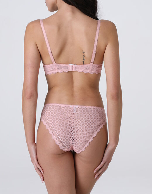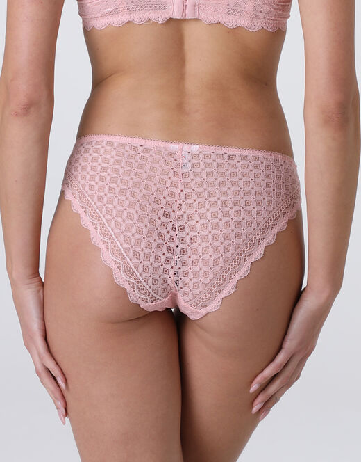 Lo slip Graphic Lace in pizzo rosa vintage unisce delicatezza e comfort in un capo elegante e femminile. Realizzato in morbido pizzo sia sul davanti che sul retro, è caratterizzato da una cucitura centrale che valorizza la silhouette. Il bordo smerlato in pizzo, rivolto verso il basso, dona una finitura raffinata e un tocco di leggerezza sulla pelle.