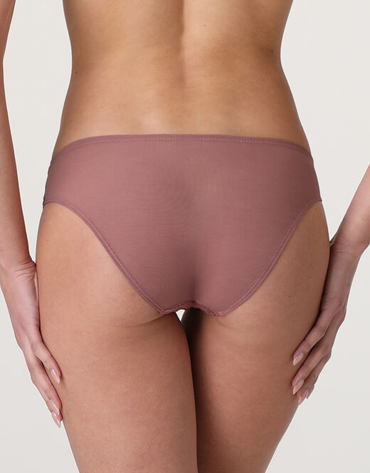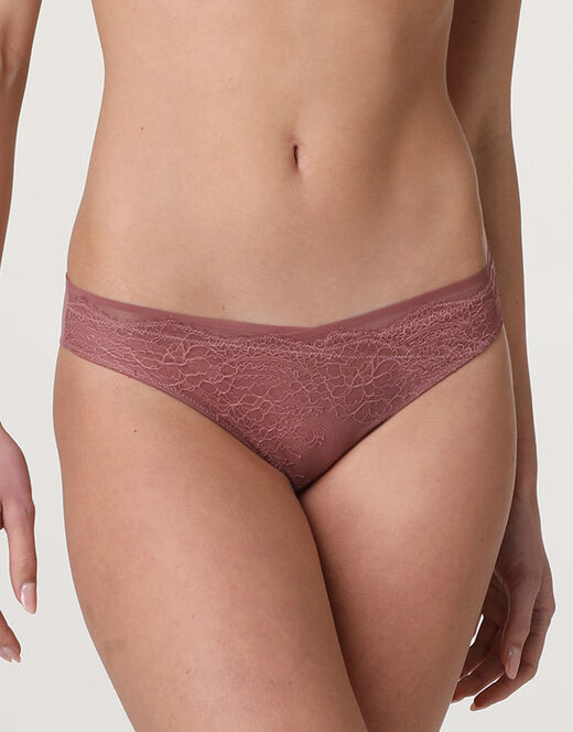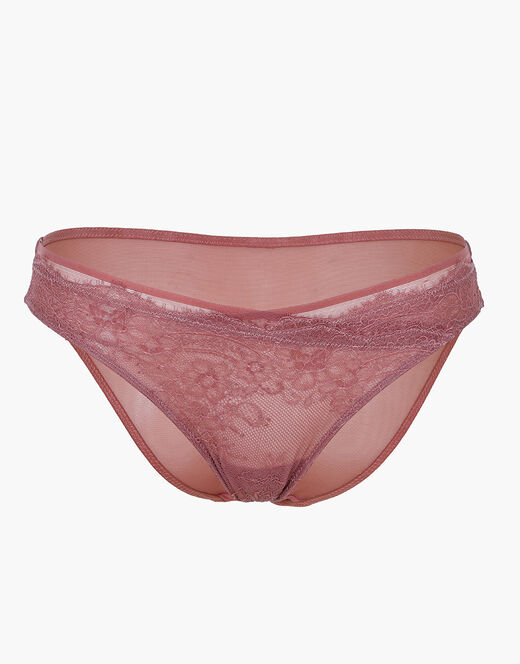 Scopri lo slip della collezione Royal Lace, realizzato in raffinato pizzo nel colore blush scuro. Il fronte in pizzo è arricchito da un delicato dettaglio incrociato al centro, che aggiunge un tocco elegante e femminile, mentre il retro in morbido tulle garantisce comfort e leggerezza.