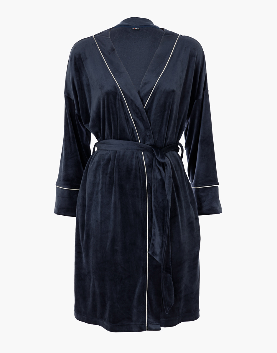 Il modello presenta piping a contrasto lungo i profili, cintura removibile che valorizza la silhouette e pratiche tasche a filetto, per unire funzionalità e femminilità in un unico capo. La vestibilità morbida e la texture soffice della ciniglia la rendono un capo ideale da indossare sopra il pigiama o l’homewear preferito.