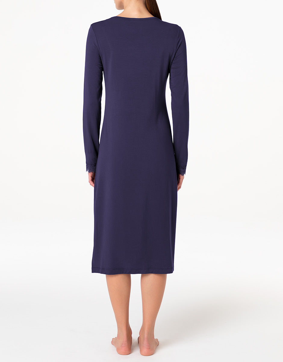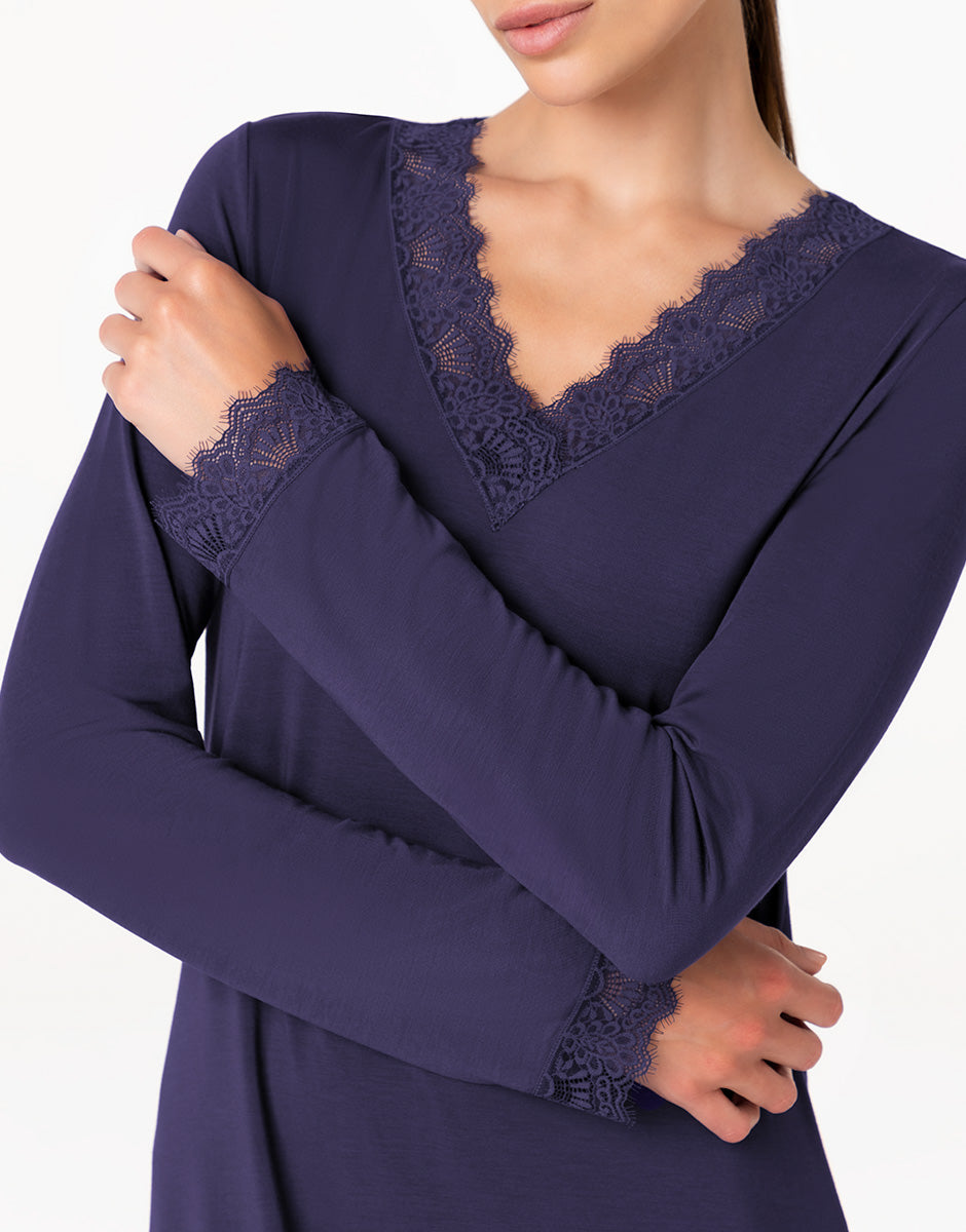 Il colore blu notte esalta l’eleganza del modello, rendendo questa camicia da notte ideale per chi ama un’intimità curata, femminile e confortevole.