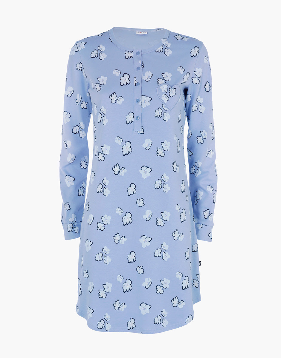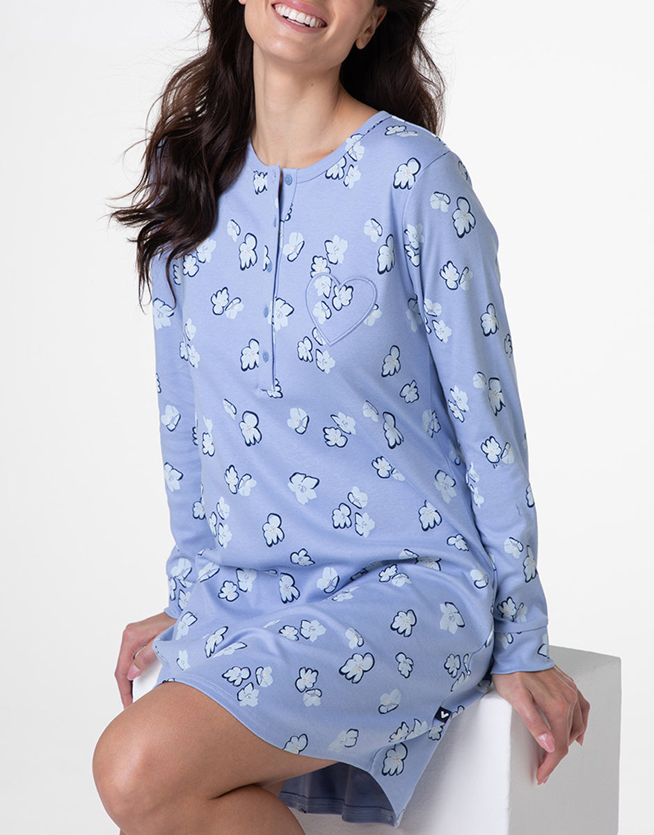 Concediti il massimo comfort nelle tue notti con questa camicia da notte in morbido interlock di puro cotone, perfetta per le stagioni più fresche. Il fondo azzurro polvere, arricchito da una delicata stampa allover, dona freschezza e originalità al capo. Il modello serafino con cinque bottoni aggiunge un tocco classico e pratico, mentre la tasca patch a forma di cuore sul petto regala un dettaglio dolce e femminile.