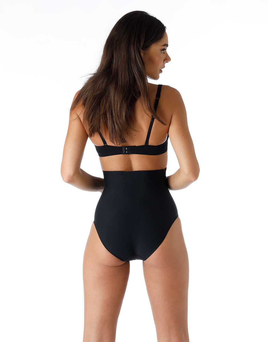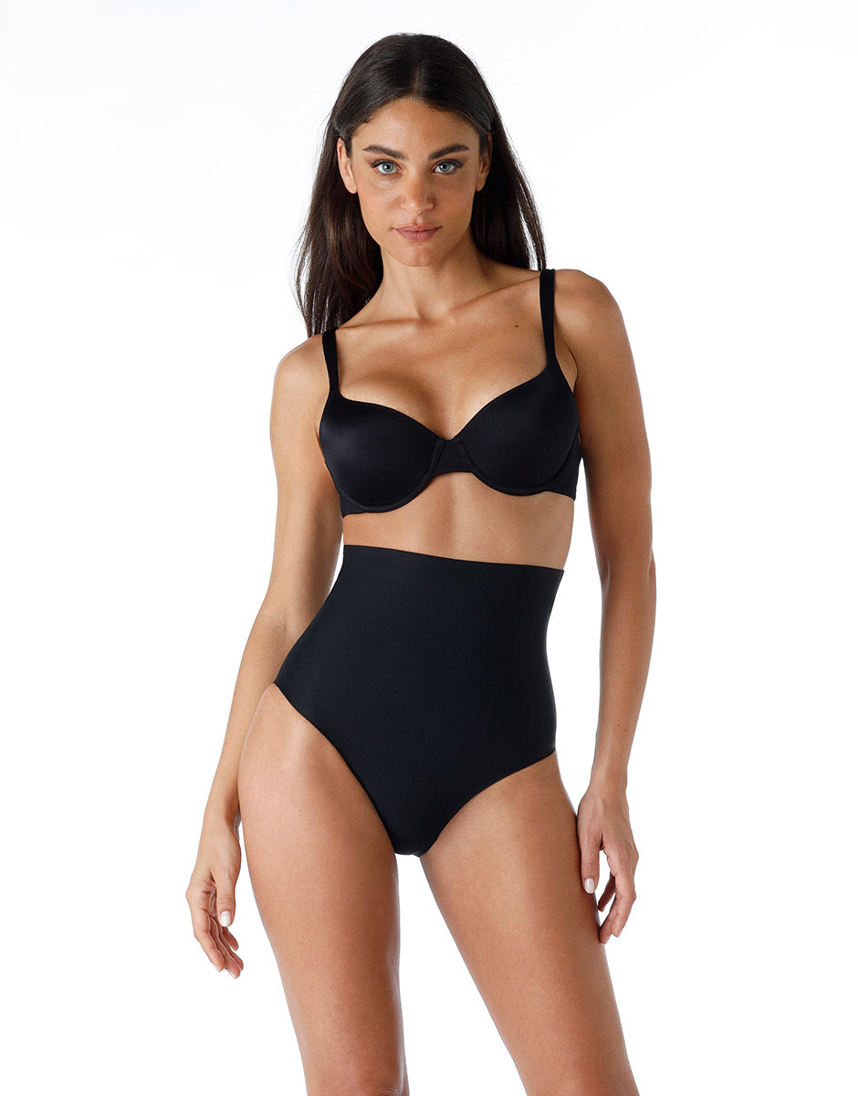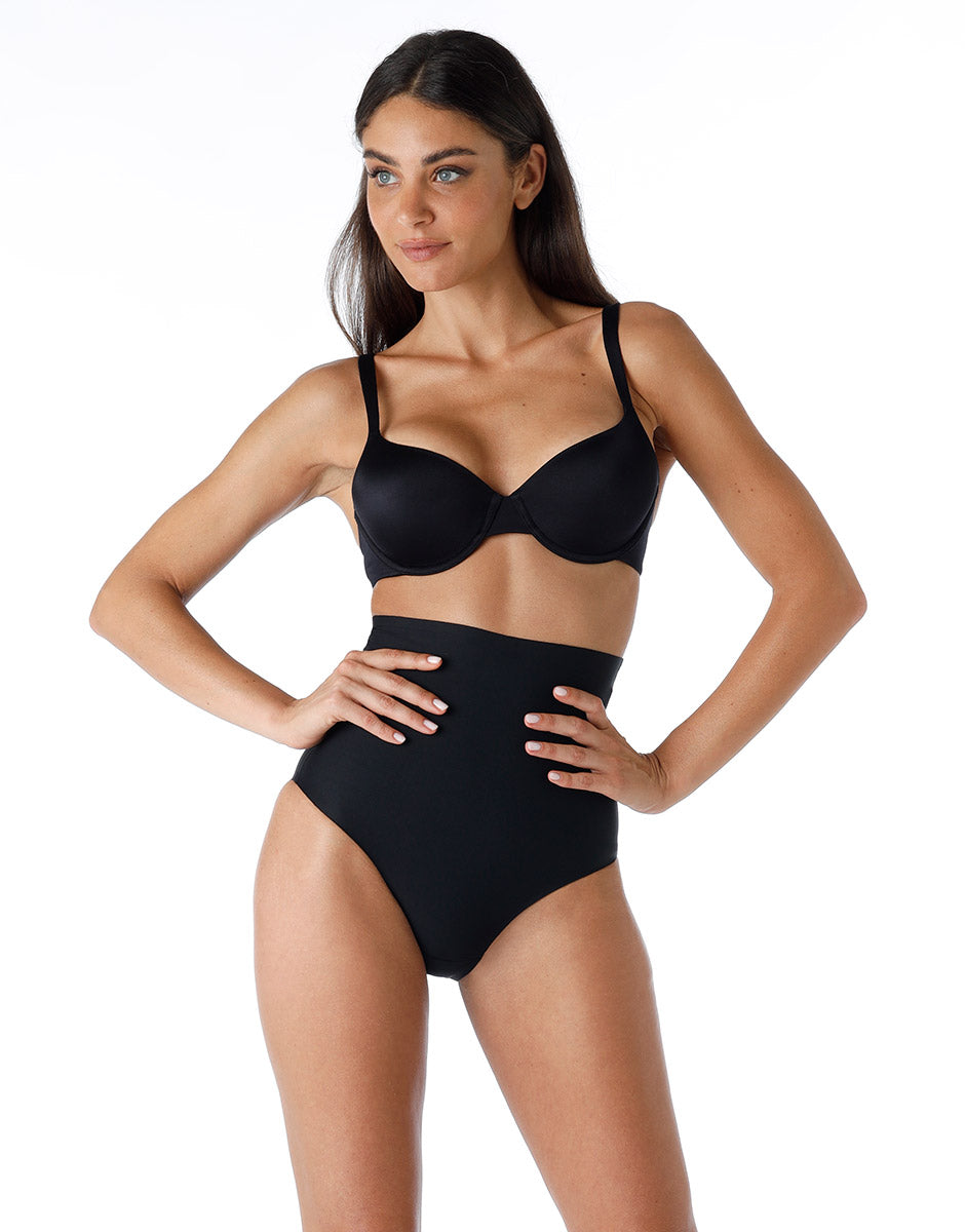 Le finiture senza cuciture assicurano un effetto invisibile sotto gli abiti, mentre il colore nero conferisce un tocco elegante e versatile, perfetto per ogni outfit. Questo slip vita alta è il capo perfetto da indossare quotidianamente, offrendo supporto e discrezione senza rinunciare al comfort.