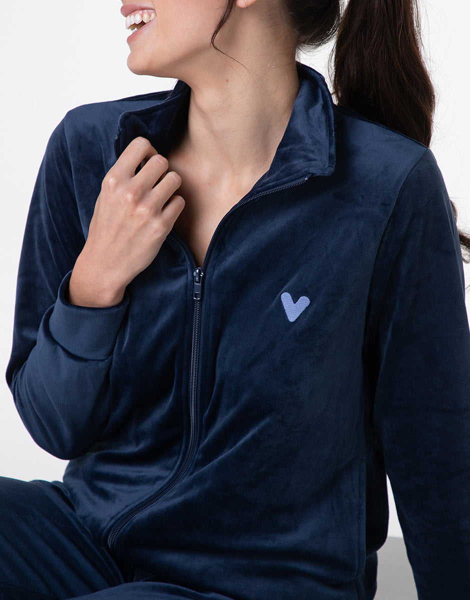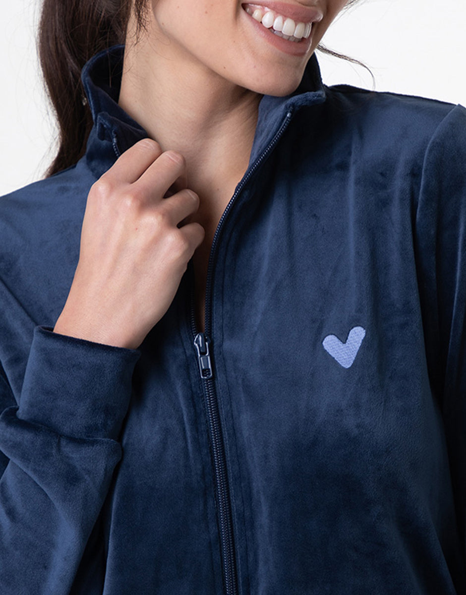 Concediti il massimo comfort con questo homewear aperto in morbida ciniglia, perfetto per i momenti di relax in casa ma abbastanza versatile da essere indossato anche all’esterno. La casacca, in un elegante blu notte, è dotata di una pratica chiusura con zip e di un delicato ricamo a forma di cuore sul petto laterale in tono azzurro, che aggiunge un tocco di dolcezza e stile. Le tasche a filetto e i polsini rifiniti completano il design, garantendo comodità e praticità in ogni movimento.