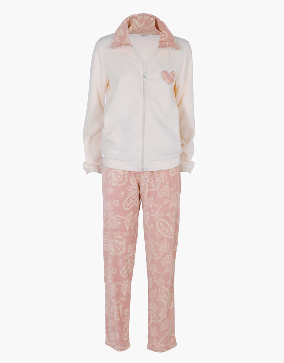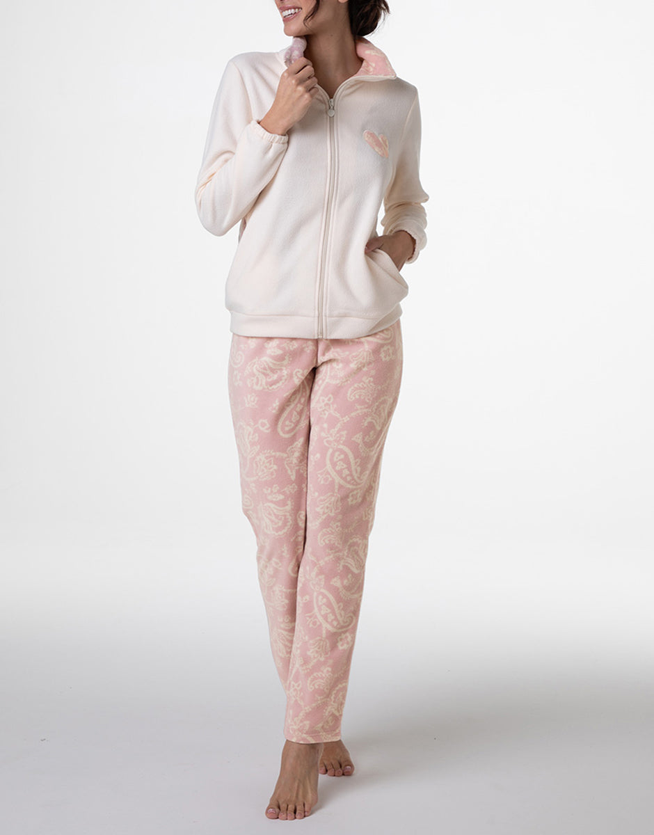 Un completo homewear morbido e confortevole, ideale per rilassarsi a casa nelle giornate più fresche. La casacca aperta in micropile avorio è arricchita da dettagli femminili, come cursore a forma di cuore sulla zip, patch e ricami laterali a cuore. L’interno del collo richiama il colore rosa del pantalone, creando un coordinamento delicato e armonioso. Le tasche a filetto e il fondo manica leggermente arricciato assicurano praticità e comfort.