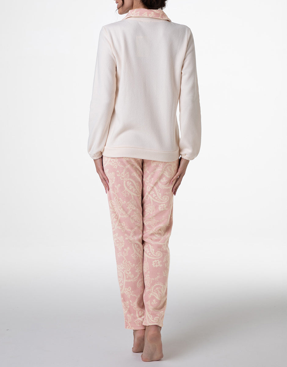 I pantaloni rosa con fantasia avorio completano il look con morbidezza e stile, offrendo una vestibilità comoda sulla pelle. Un completo pensato per unire calore, praticità e un tocco di dolcezza in casa.