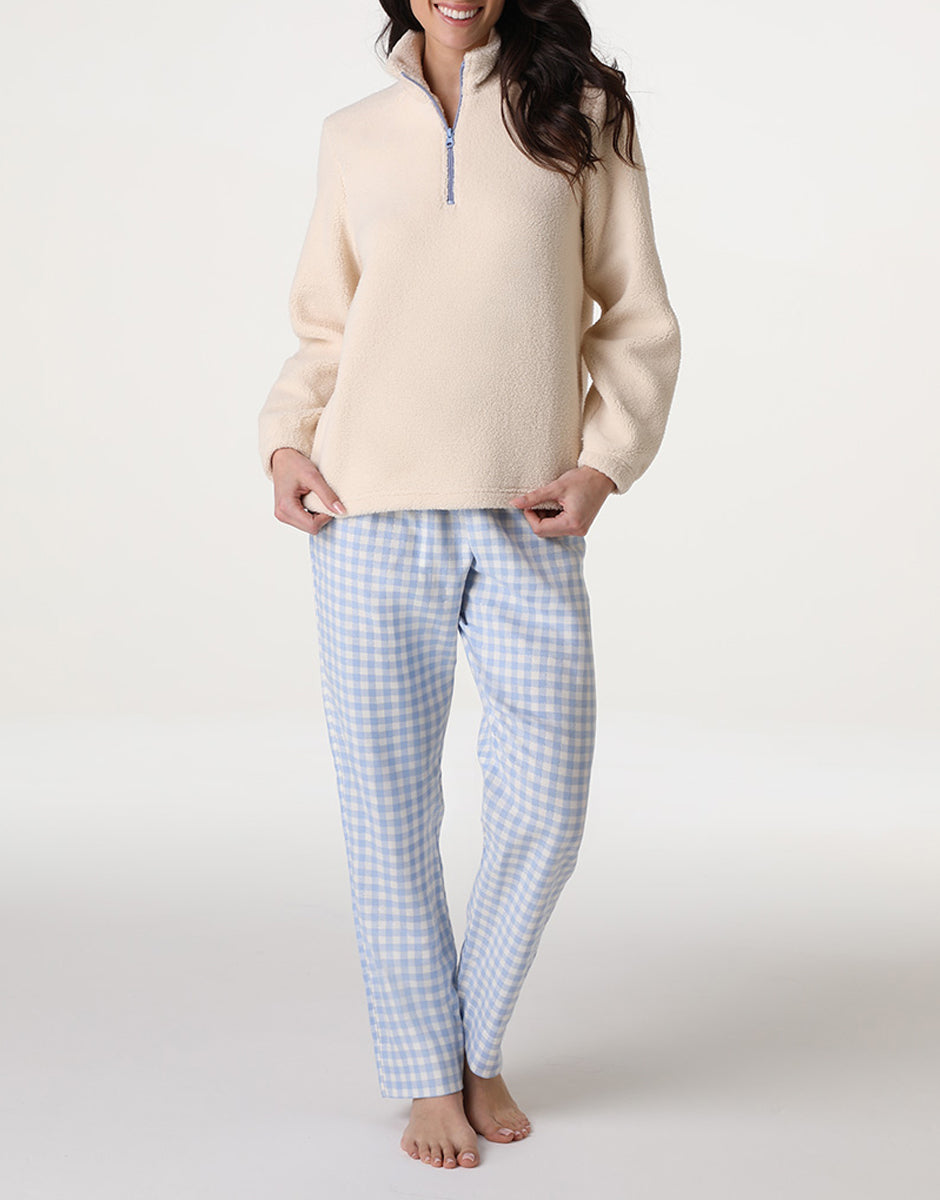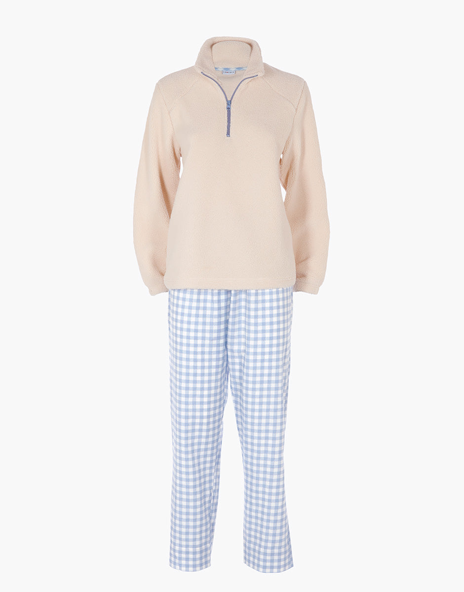 Un homewear lungo da donna pensato per garantire calore e comfort durante le giornate e le serate più fredde. La casacca è realizzata in morbida pelliccetta agnellata bianca con mezza zip azzurra a contrasto, mentre il pantalone è in flanella non brushata a quadretti bianchi e azzurri, creando un delicato contrasto che valorizza i dettagli del capo.