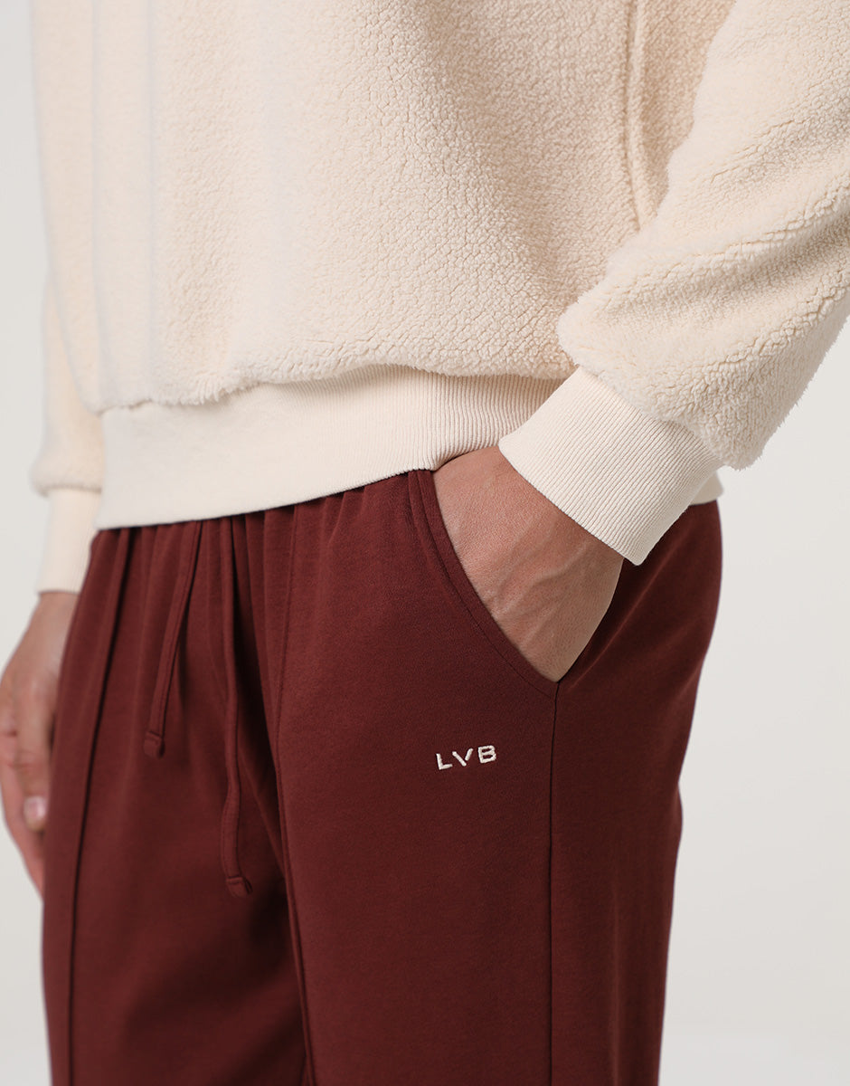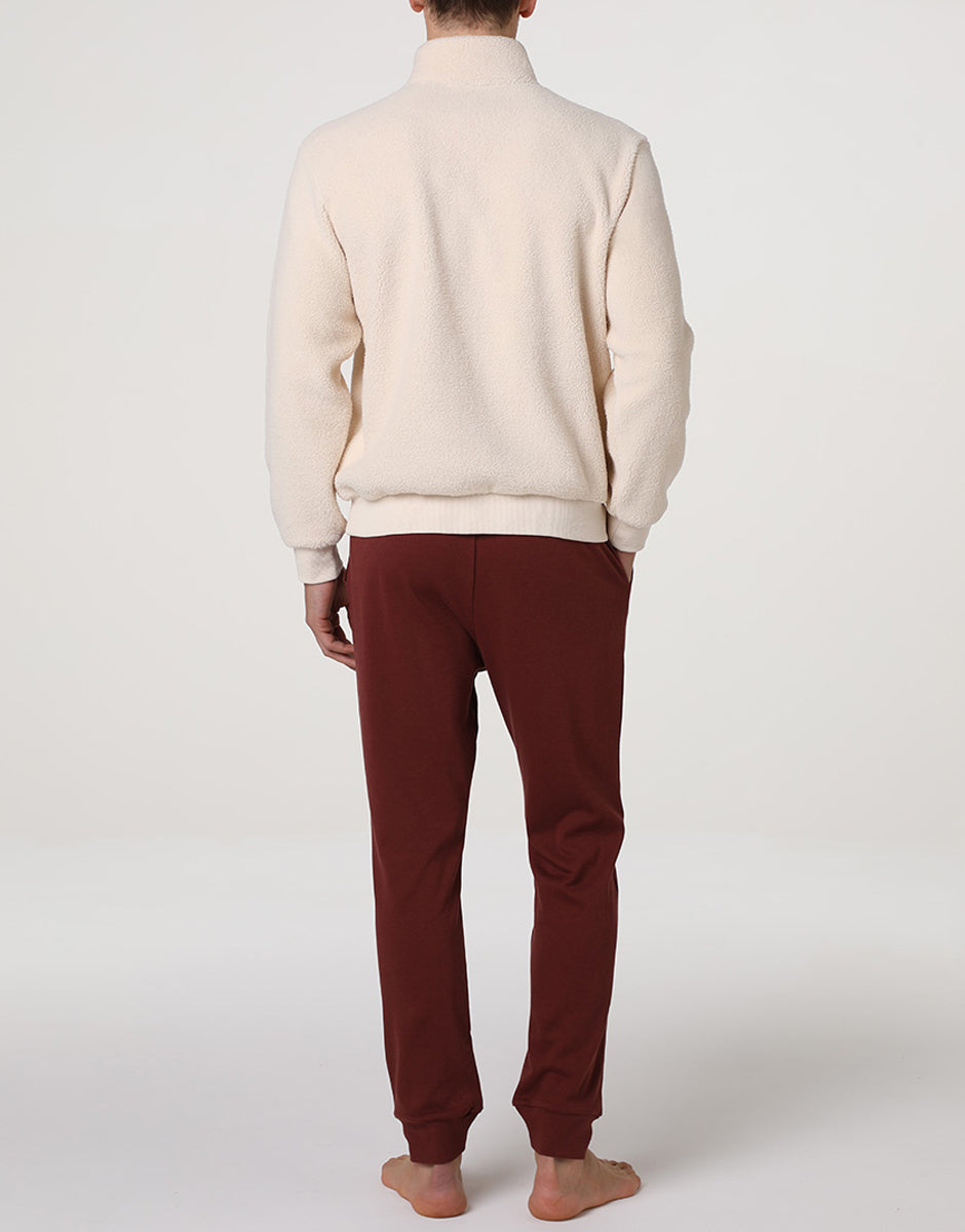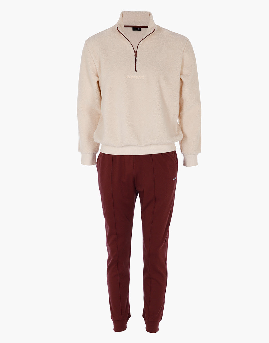 Scopri il nostro confortevole homewear da uomo con zip, pensato per garantirti calore e comodità durante le giornate di relax in casa. La casacca in morbida pelliccetta avorio è arricchita da un collo serafino alto con zip bordeaux a contrasto, per un look pratico e contemporaneo. Il pantalone in interlock bordeaux completa il completo con stile e funzionalità. Il ricamo tono su tono sul petto e i polsini su fondo manica e casacca aggiungono cura nei dettagli, mentre il pantalone in cotone è dotato di coulisse regolabile, polsini aderenti, tasche a filetto e una cucitura decorativa lungo la gamba che dona un tocco di carattere.