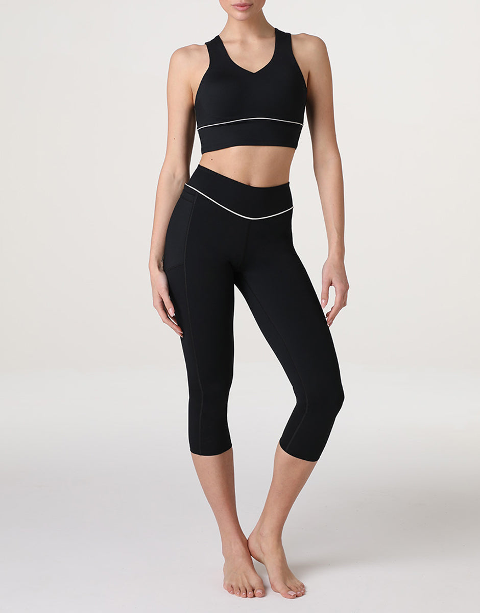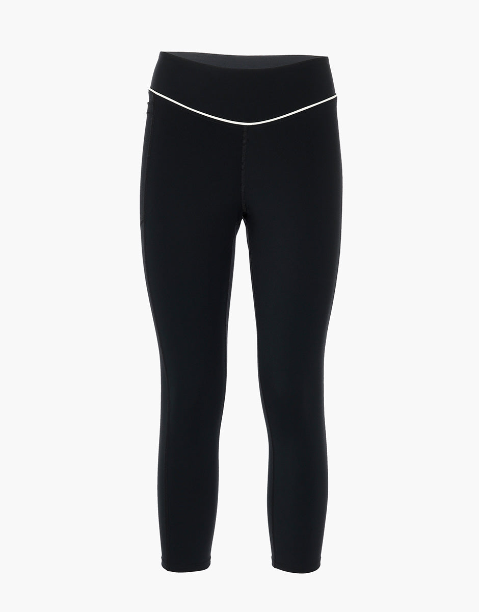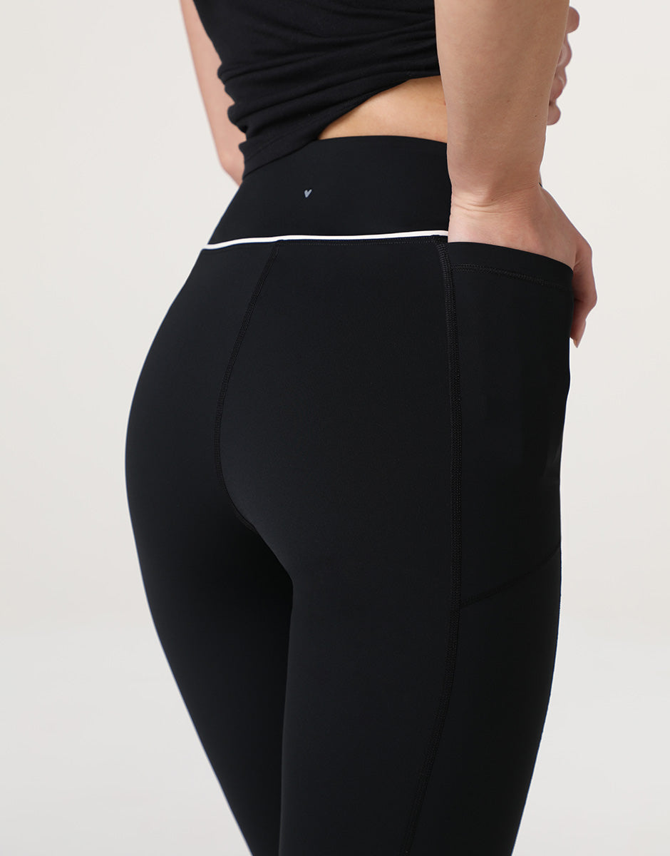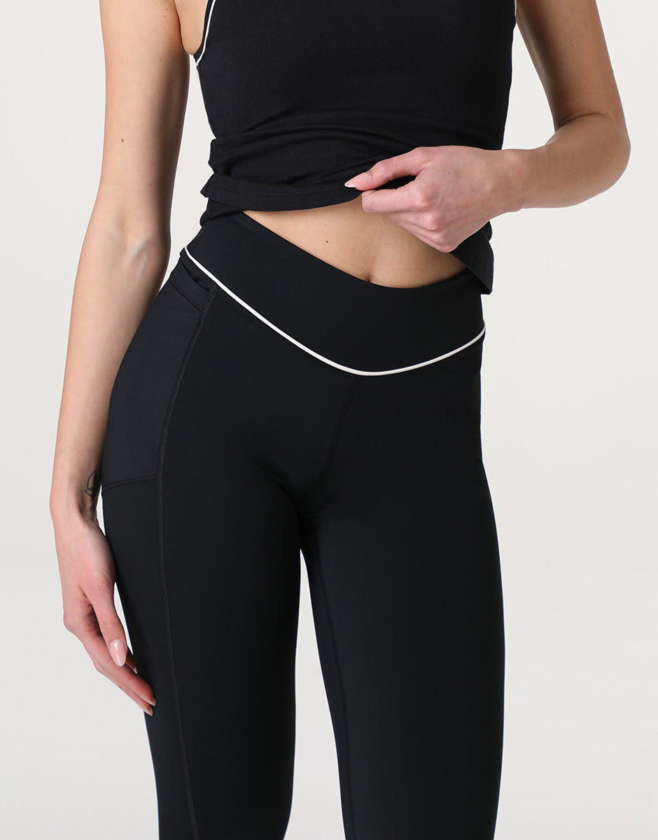 Realizzati in microfibra elasticizzata e modellante, il tessuto definisce e valorizza la silhouette senza comprimere, garantendo libertà di movimento in ogni esercizio. La vita normale offre una vestibilità comoda e naturale, mentre la tasca laterale aggiunge praticità per piccoli oggetti. Il piping bianco a contrasto sulla vita dona un tocco femminile e curato al capo.