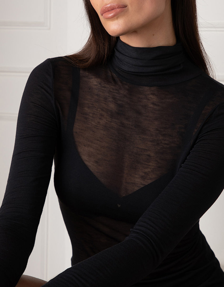 Il collo alto e le maniche lunghe rendono questo capo ideale da indossare come sottogiacca oppure da solo per un look essenziale e raffinato. Le finiture invisibili, con cuciture piatte, elastiche e sottili su scollo, giromanica e fondo, assicurano una vestibilità pulita e confortevole, perfetta da abbinare a ogni stile.