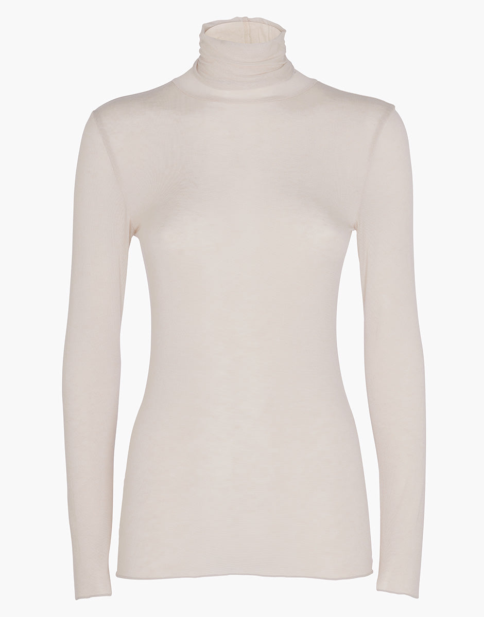 Il collo alto e le maniche lunghe la rendono versatile e confortevole, ideale come sottogiacca o da indossare da sola per un look sobrio e sofisticato. Le finiture invisibili, con cuciture piatte, elastiche e sottili su scollo, giromanica e orlo, assicurano una vestibilità impeccabile.