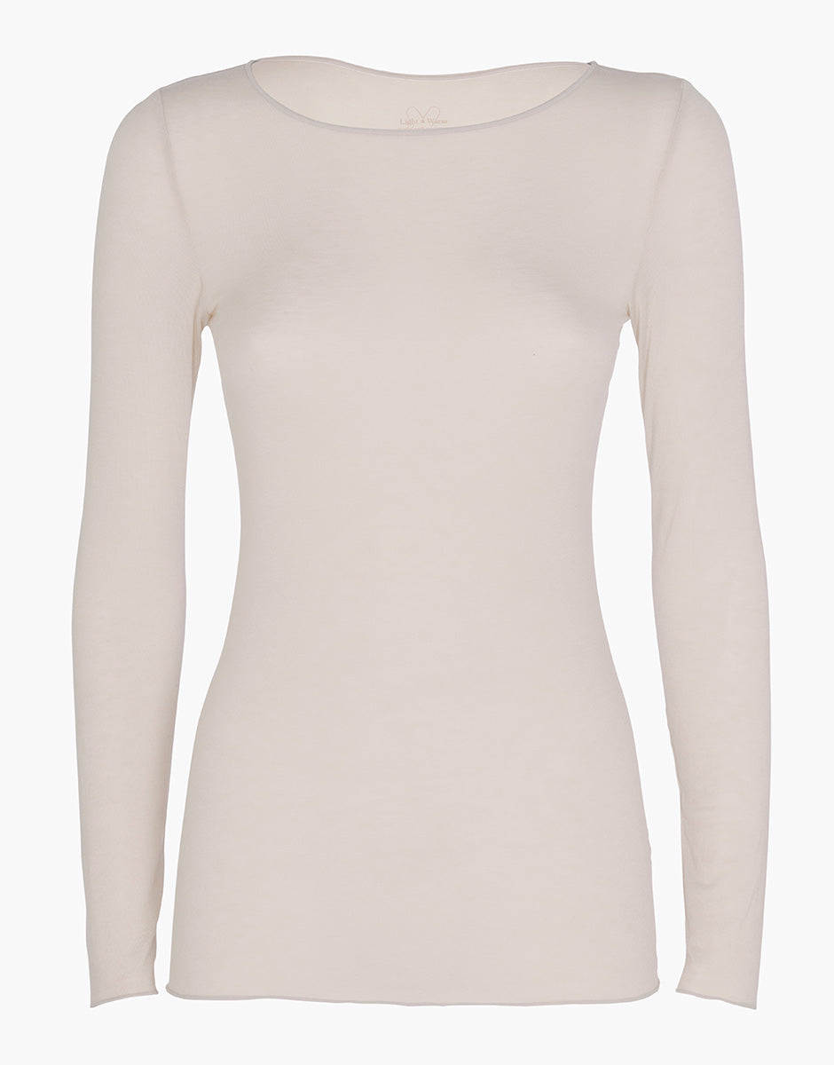 Il design con scollo barchetta valorizza il décolleté con stile, mentre le maniche lunghe offrono comfort e protezione. Le finiture invisibili, con cuciture piatte, elastiche e sottili su scollo, giromanica e orlo, garantiscono una vestibilità impeccabile e discreta.