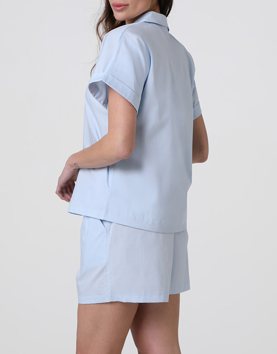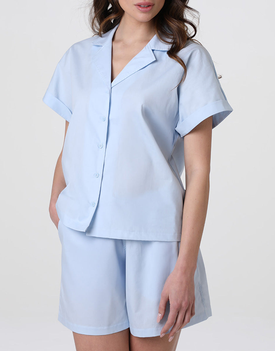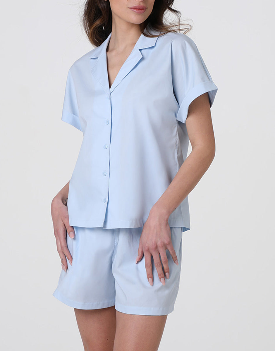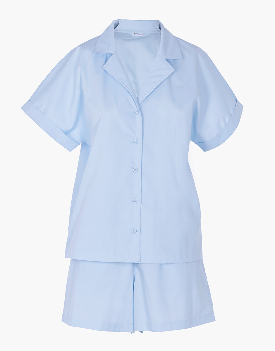 Pigiama Corto Aperto in Tela di Cotone, azzurro