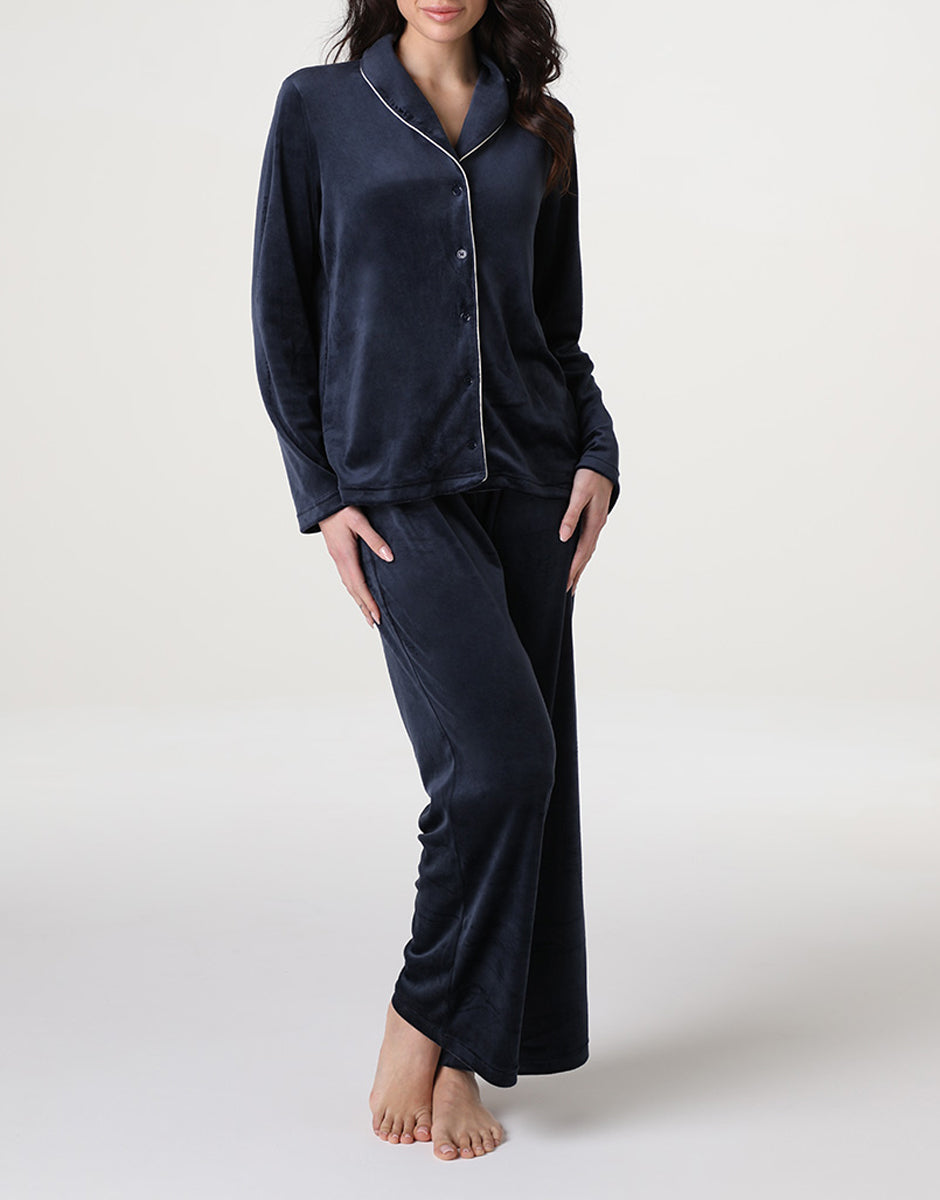 Un pigiama lungo da donna elegante e confortevole, realizzato in morbida ciniglia dal leggero effetto lucido. Il colore blu notte regala al capo un aspetto raffinato e senza tempo, perfetto per accompagnare le tue serate di relax con un tocco di stile.