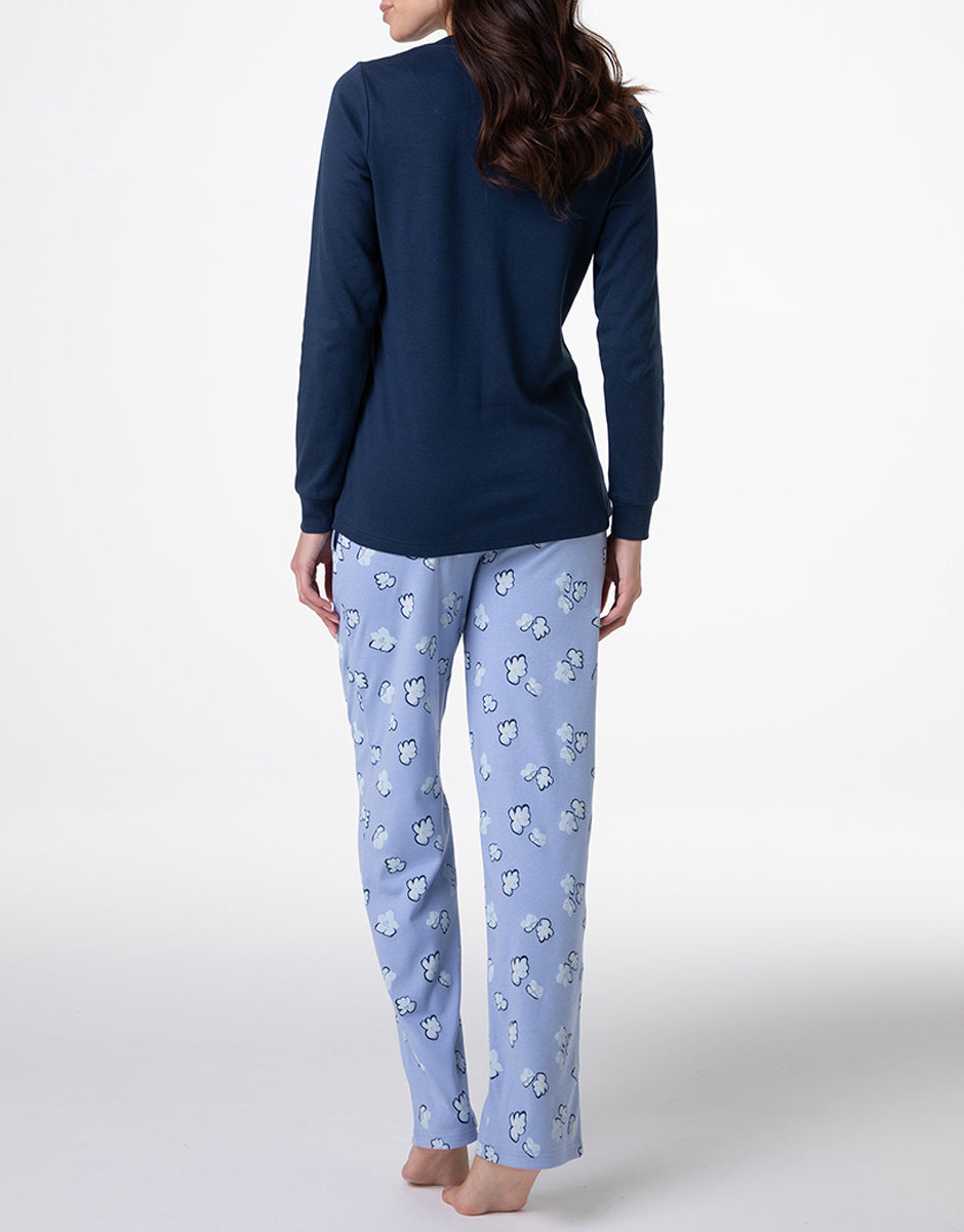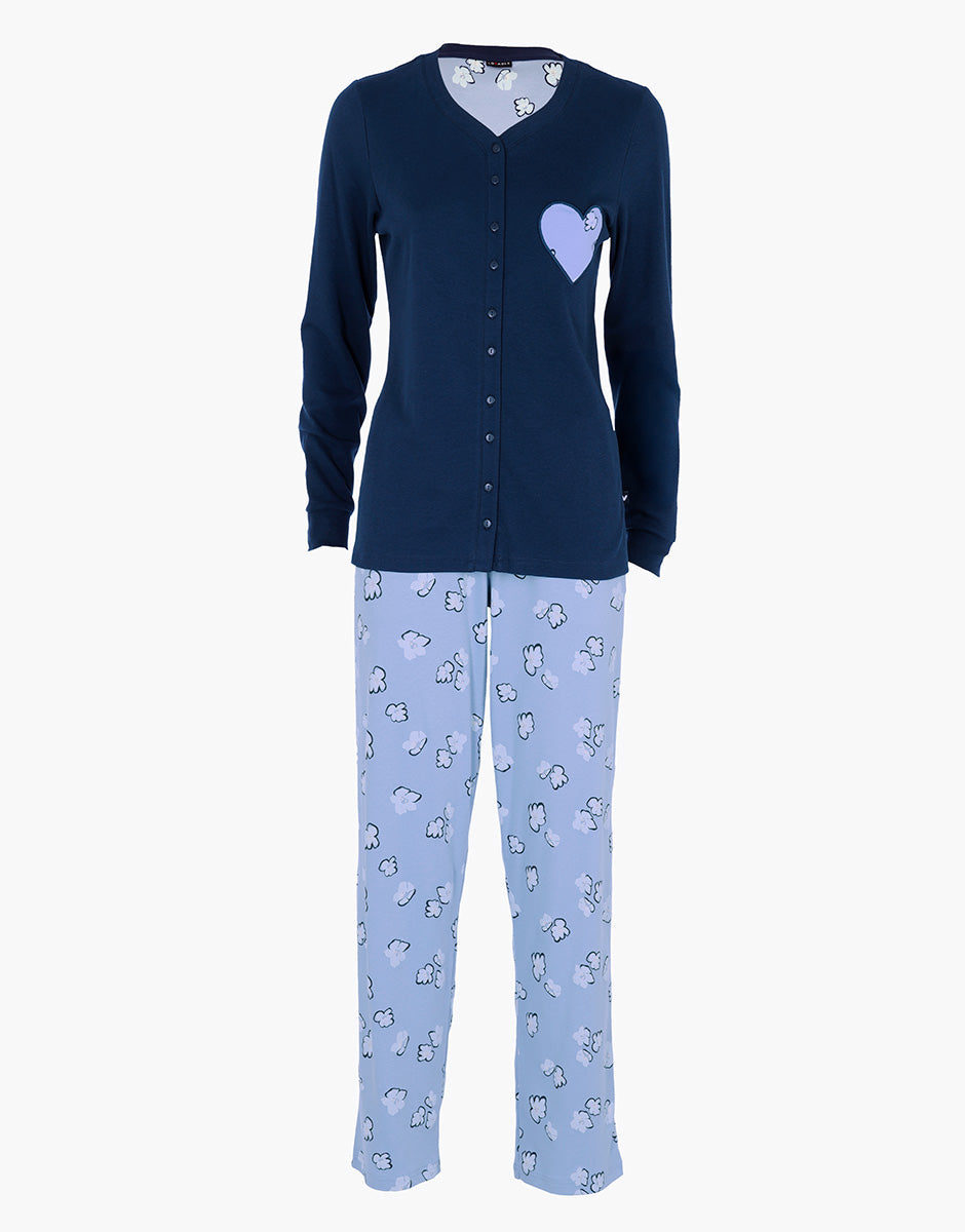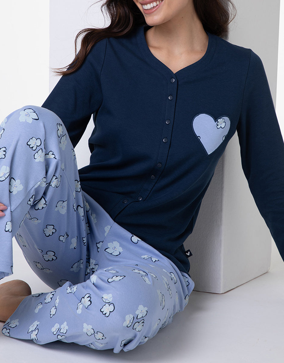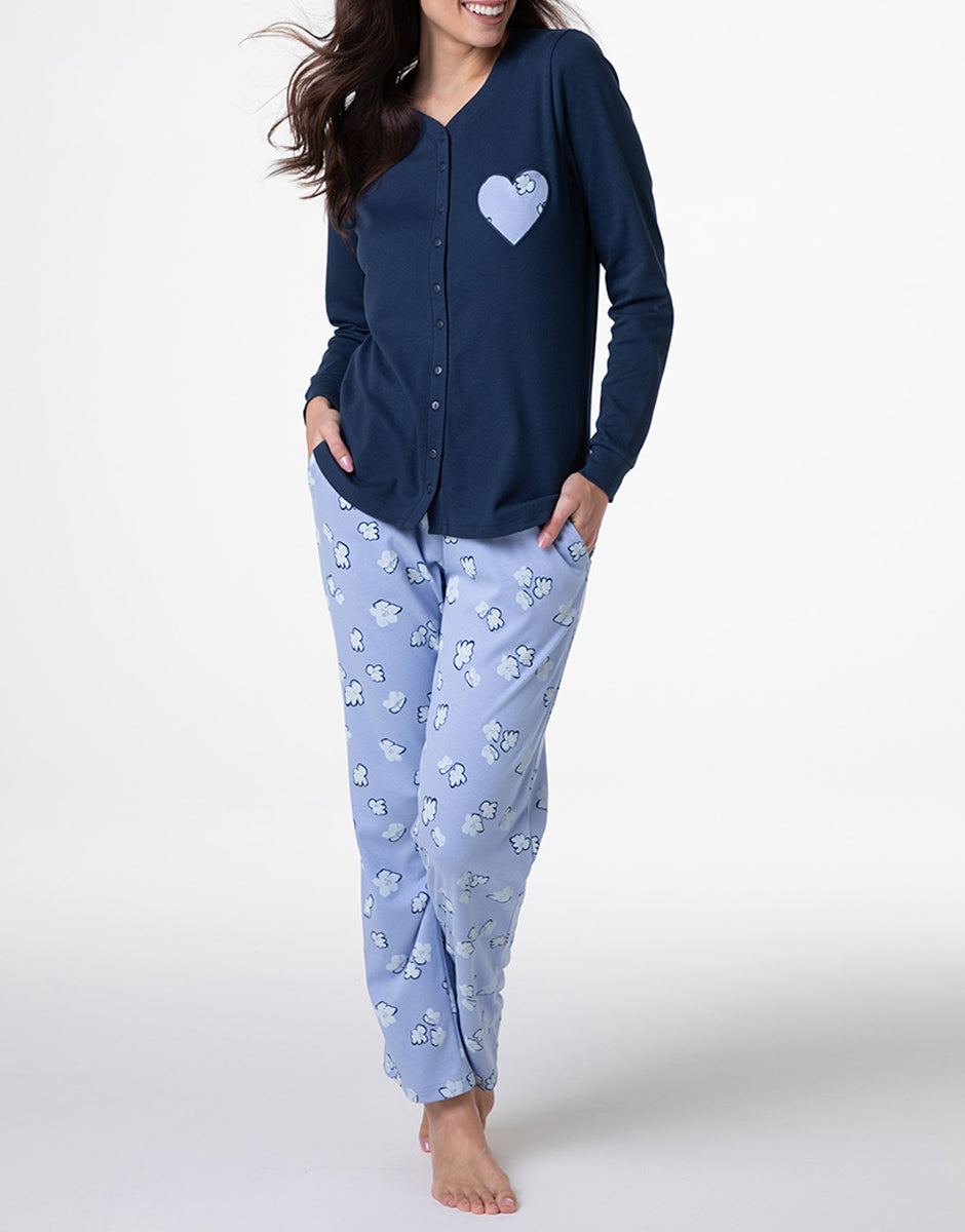 Vivi il comfort del pigiama lungo donna aperto in interlock, realizzato in puro cotone per accompagnarti con morbidezza e traspirabilità nei tuoi momenti di relax. La casacca tinta unita blu notte presenta un’apertura con bottoni tono su tono ed è arricchita da una tasca patch a forma di cuore in azzurro, con la stessa stampa coordinata al pantalone, per un dettaglio femminile e originale.