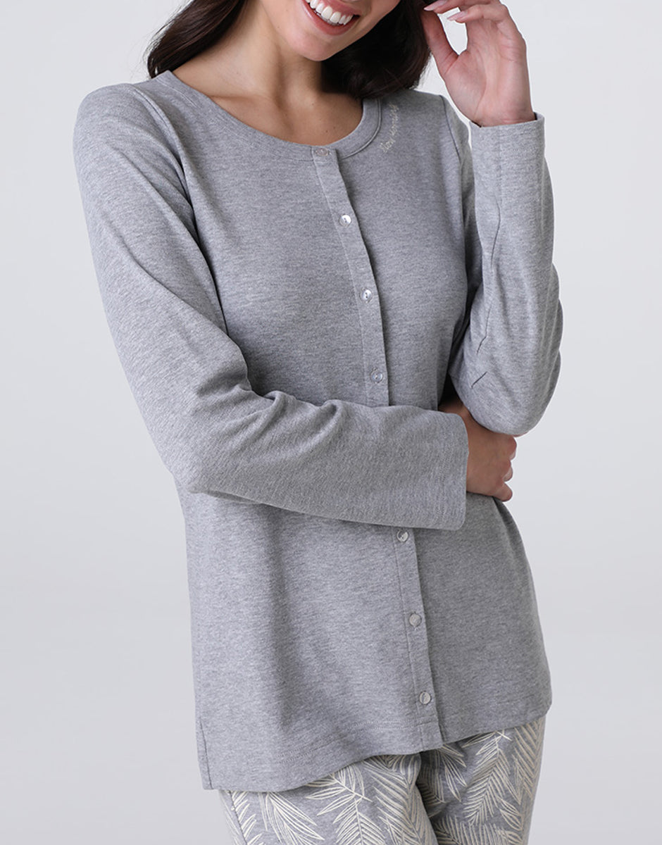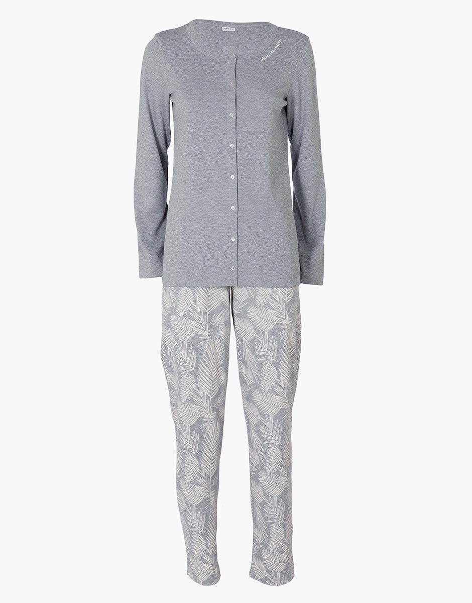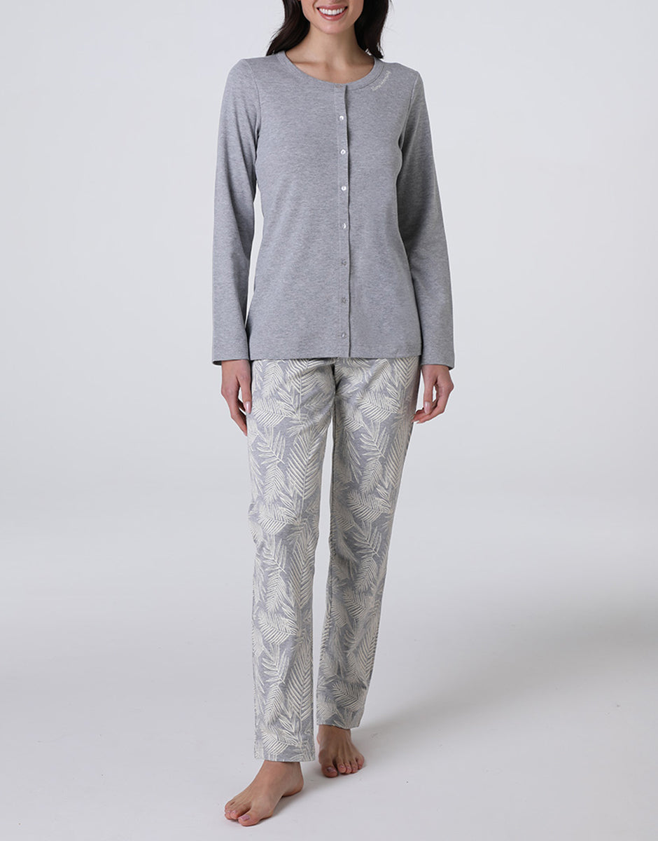 Scopri il comfort del pigiama lungo aperto in interlock, realizzato in morbido cotone misto viscosa per accompagnarti con dolcezza nei momenti di relax. La casacca, in tinta unita grigio melange, è caratterizzata da un'apertura con bottoni e da un ricamo a contrasto sullo scollo laterale, che dona un dettaglio curato e femminile.