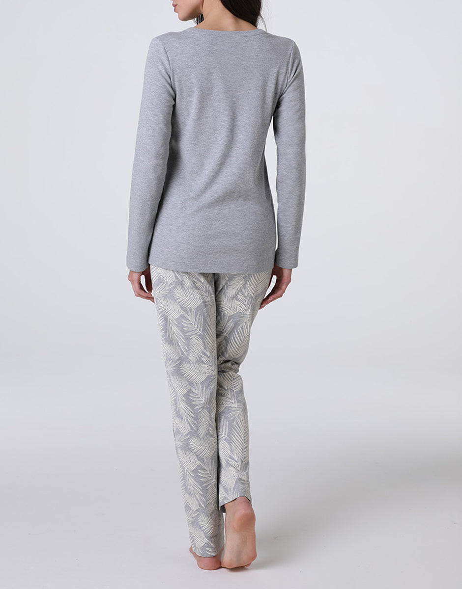 Il pantalone, con una delicata stampa su fondo grigio melange, si abbina con armonia alla casacca, creando un insieme comodo e piacevole da indossare ogni giorno.