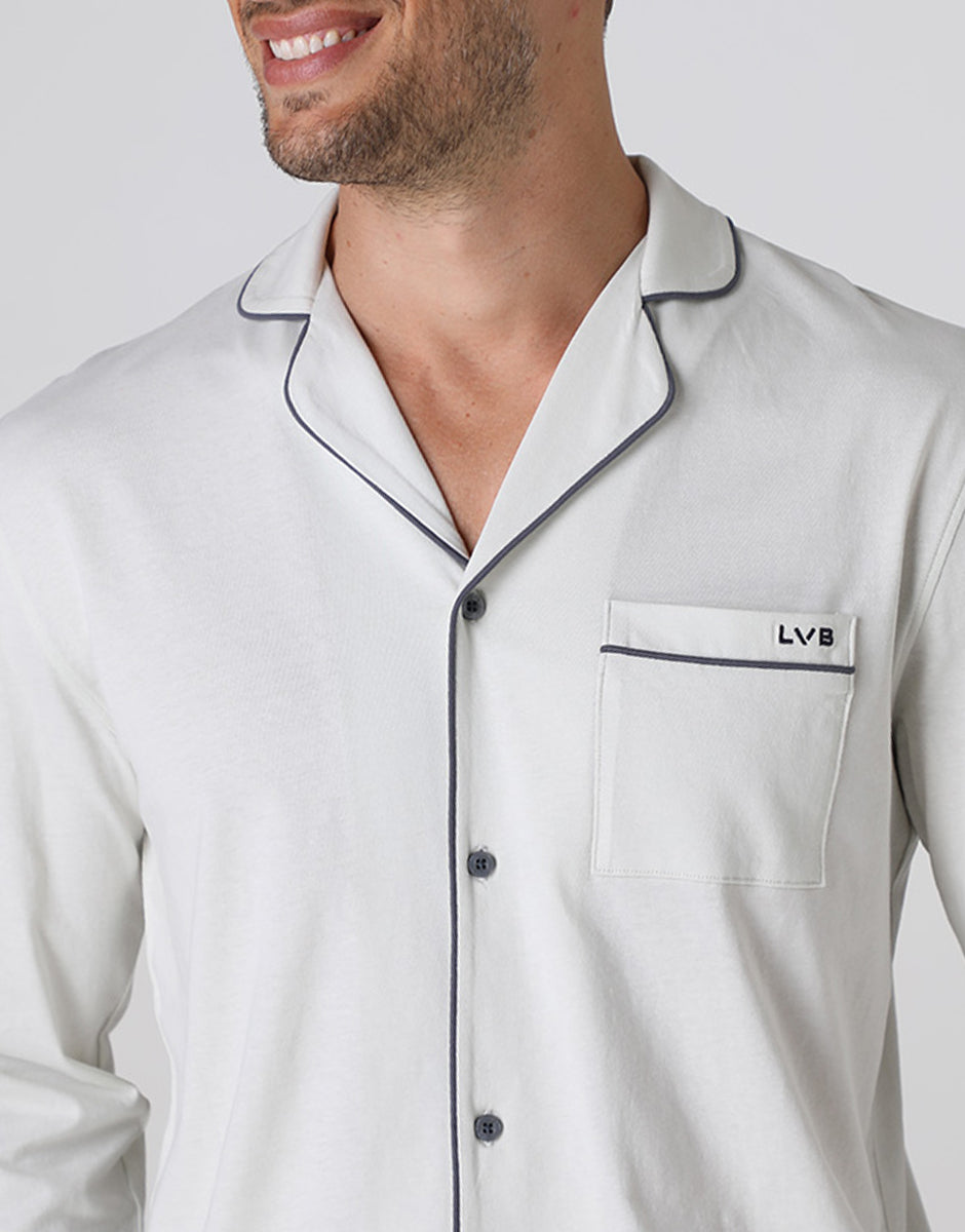 La giacca aperta in grigio chiaro è rifinita con piping a contrasto che definisce le linee del capo. La tasca applicata sul petto con ricamo LVB aggiunge un dettaglio grafico essenziale, mantenendo uno stile pulito e curato.
