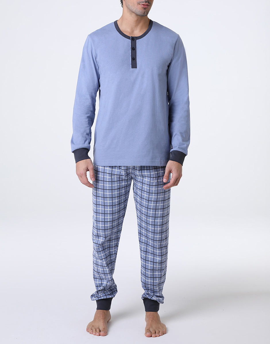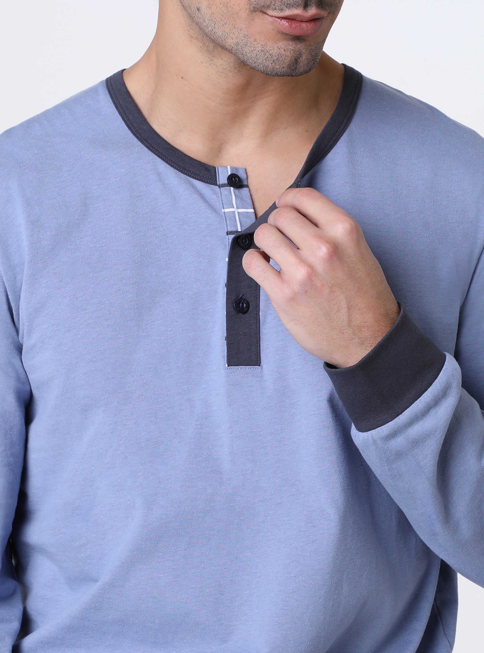 Scopri il comfort del pigiama lungo in jersey di puro cotone, pensato per i tuoi momenti di relax. La casacca a manica lunga, in tinta unita color avio, è caratterizzata da uno scollo serafino con apertura a tre bottoni e interno in tessuto stampato, lo stesso motivo che decora il pantalone per un abbinamento armonioso. Il bordo del girocollo e i polsini sono realizzati in contrasto blu, aggiungendo un tocco essenziale al design.
