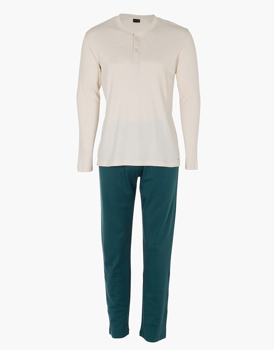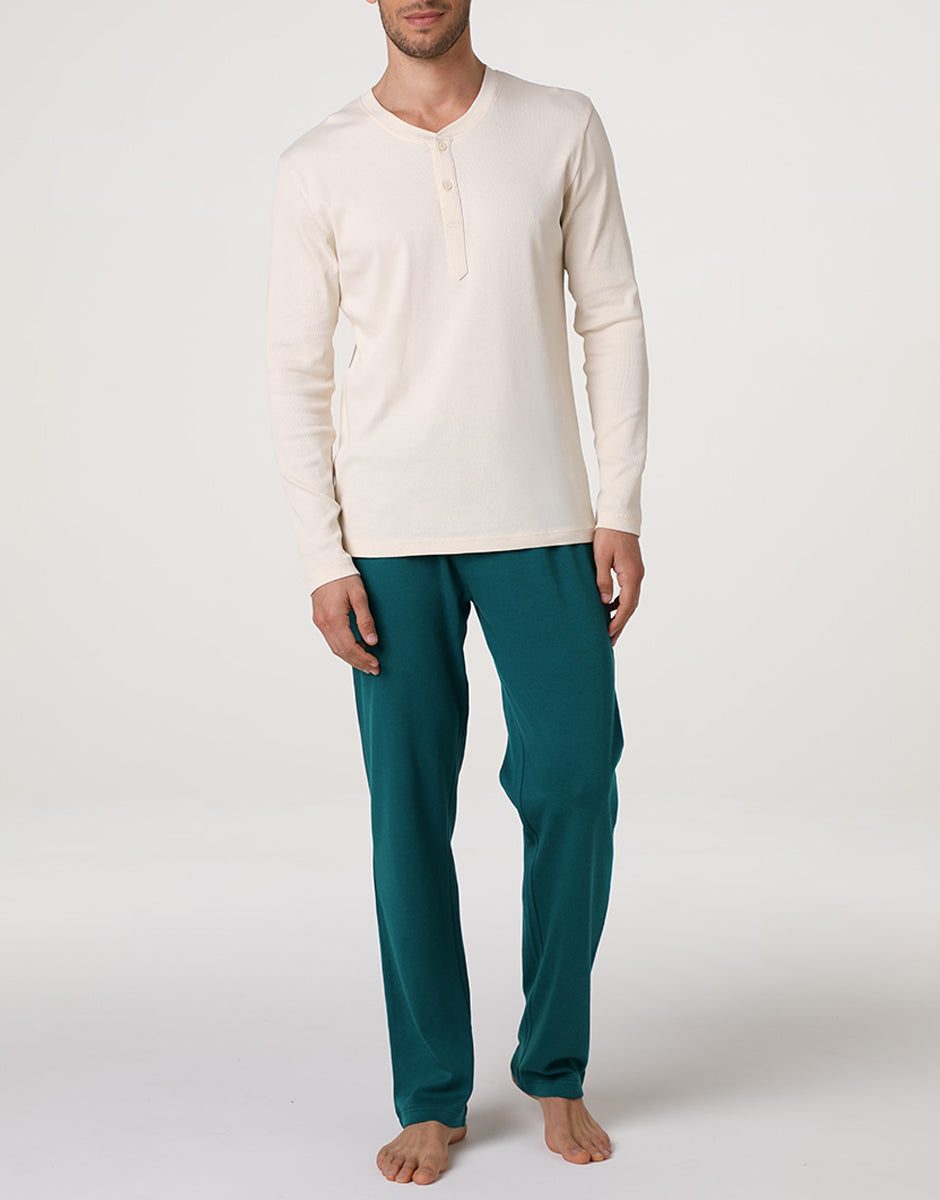 Un pigiama lungo da uomo dal design semplice e moderno. La casacca in morbido jersey a costine avorio assicura comfort e morbidezza, con collo serafino a 2 bottoni e un piccolo ricamo laterale a contrasto sul fondo della casacca.