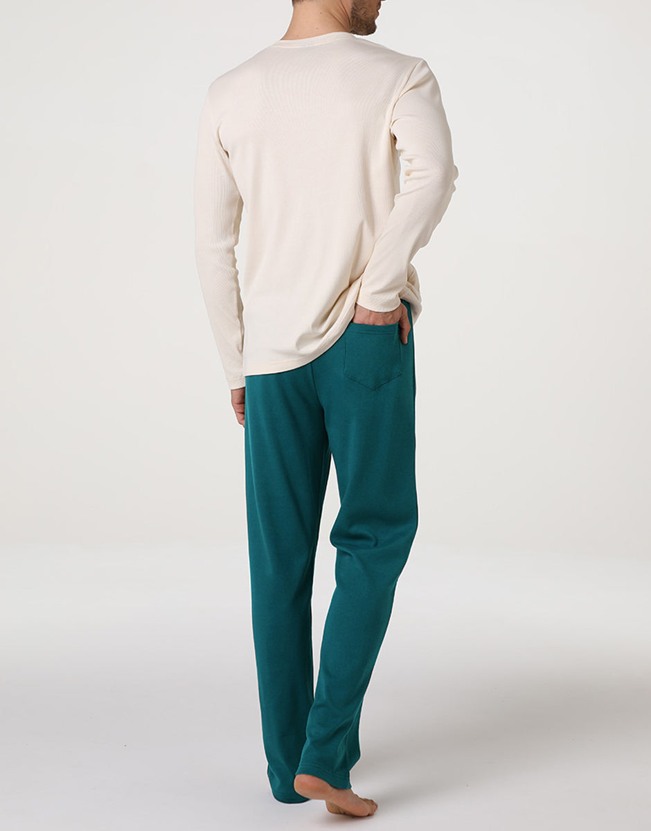 I pantaloni tinta unita verdone in cotone morbido offrono una vestibilità comoda, completando un pigiama curato, confortevole e dal look contemporaneo. La combinazione di colori – avorio e verdone – rende il capo facile da indossare e piacevole da vedere.