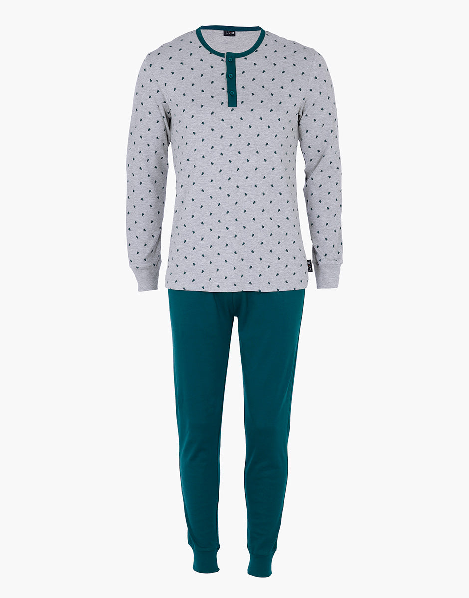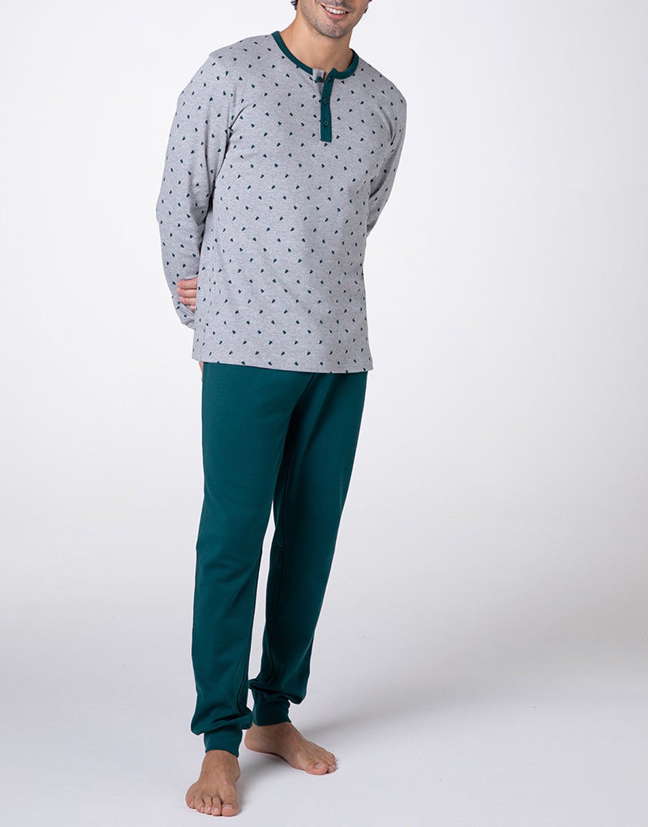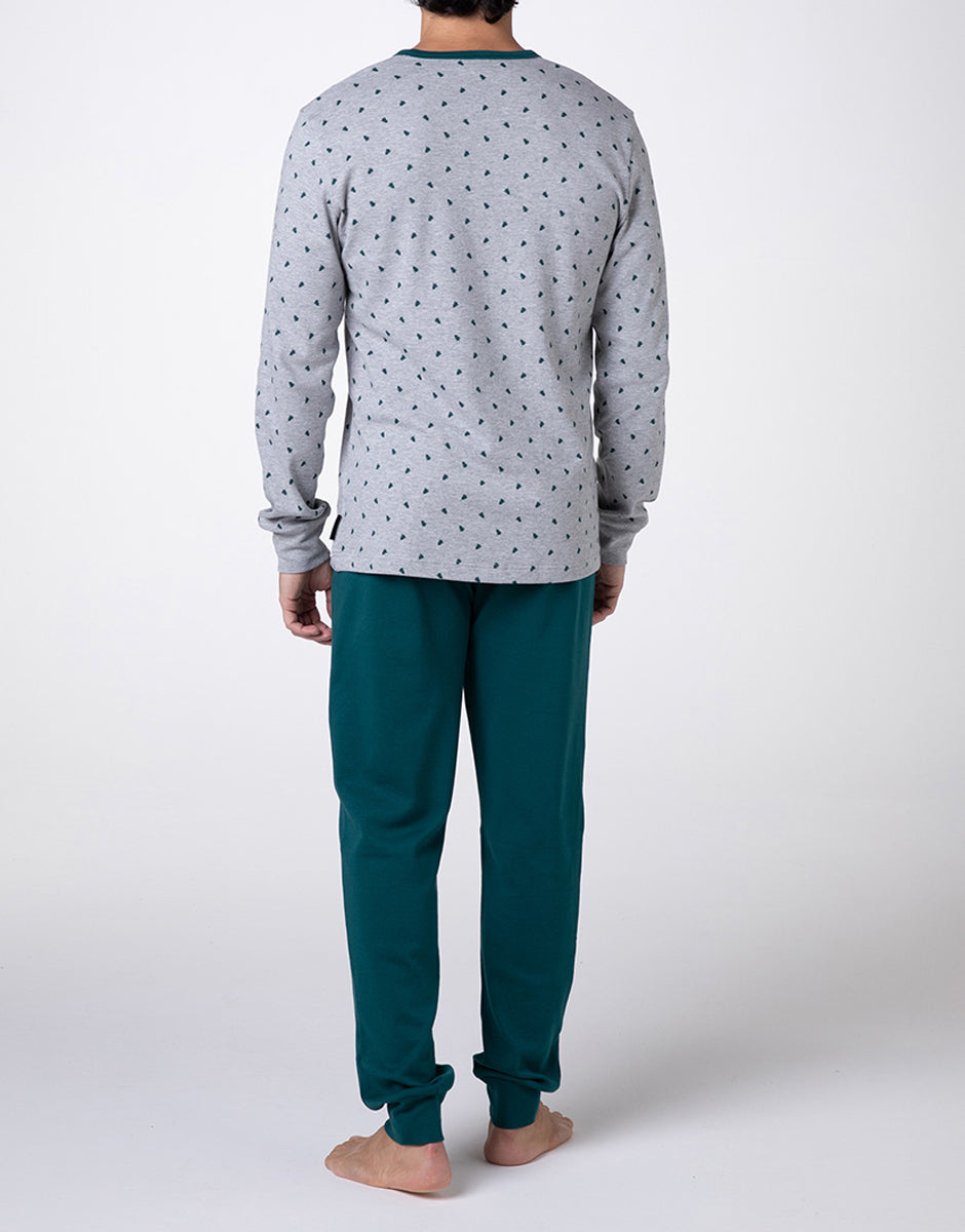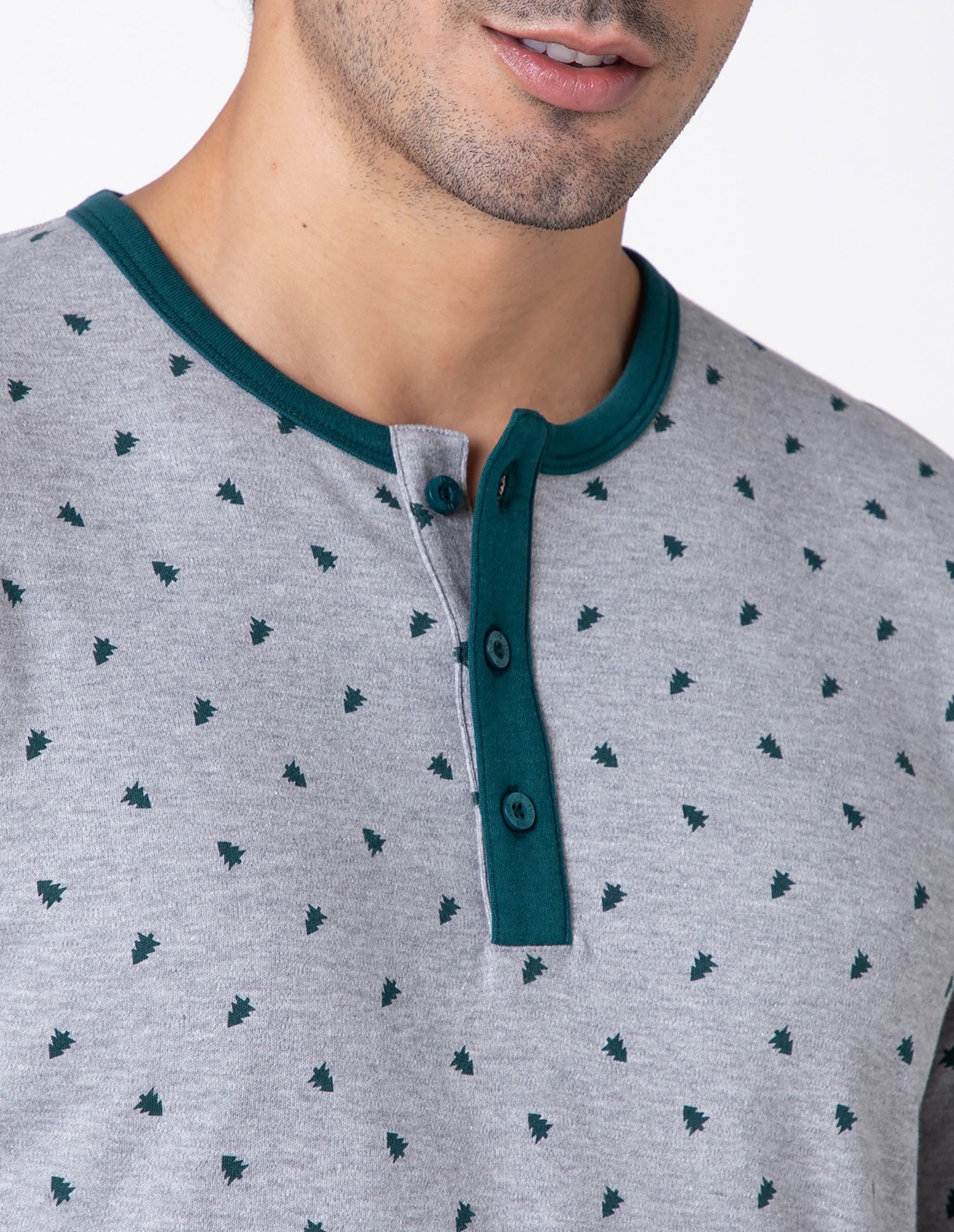 Concediti il massimo comfort con il pigiama lungo in interlock di puro cotone, ideale per affrontare le stagioni più fresche con morbidezza e stile. La casacca a manica lunga, in grigio chiaro, è caratterizzata da una raffinata stampa allover con motivo alberi e da uno scollo serafino con apertura a tre bottoni. Il profilo verde del collo richiama armoniosamente il pantalone, creando un look coordinato e curato nei dettagli.