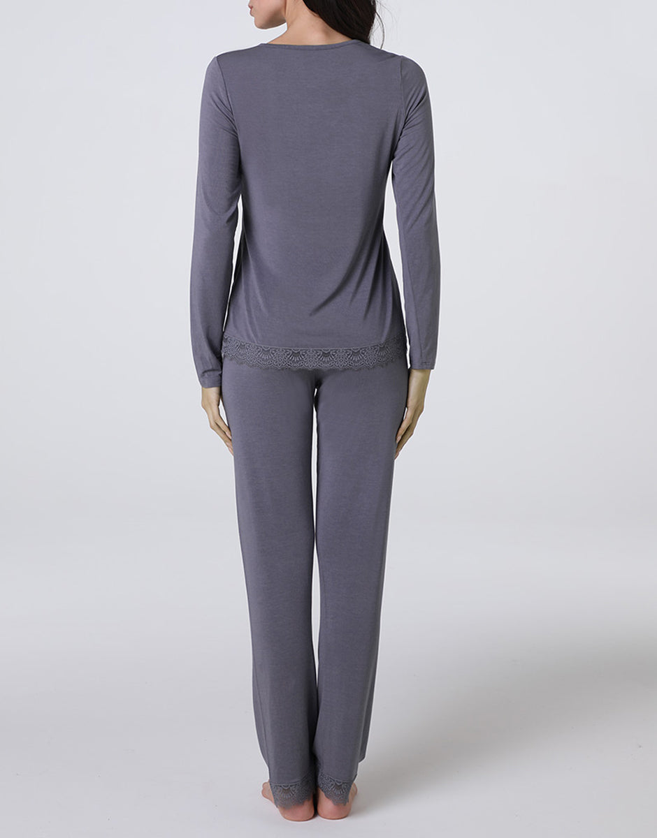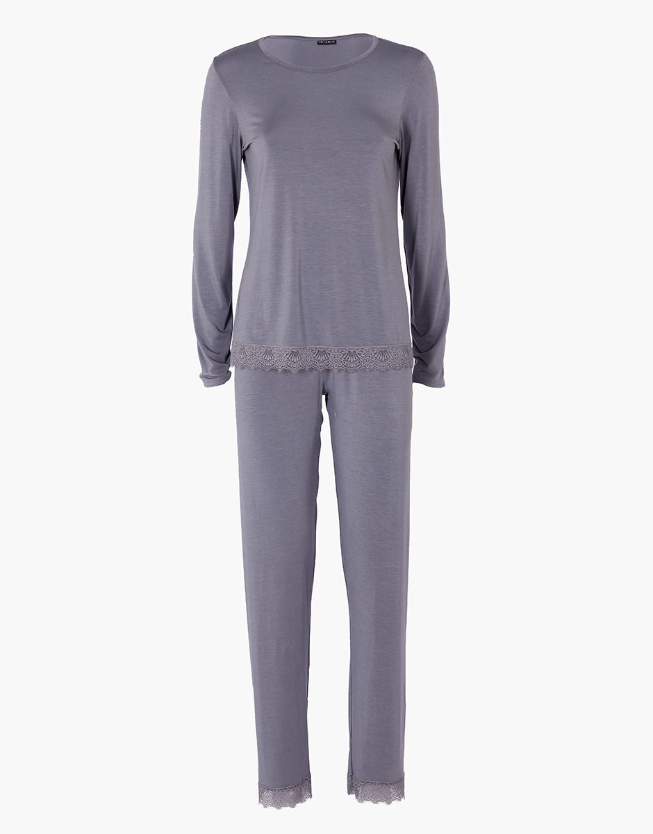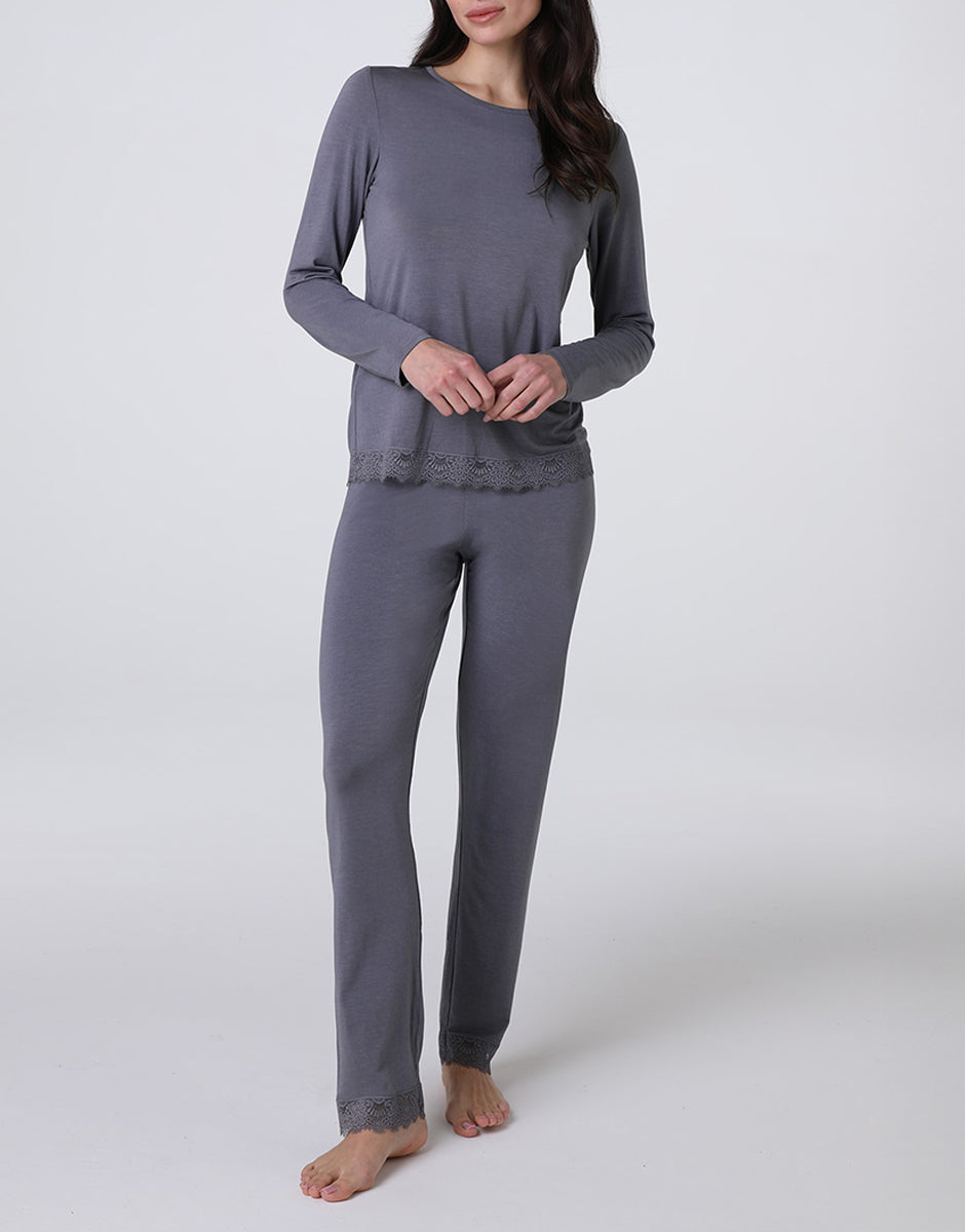 Il pigiama lungo presenta una casacca girocollo semplice e comoda, arricchita da dettagli in pizzo in trasparenza tono su tono sul fondo, coordinati con i dettagli in pizzo sul fondo del pantalone. Questo connubio di elementi dona al capo un tocco raffinato e delicato, mantenendo al contempo una vestibilità pratica e confortevole.