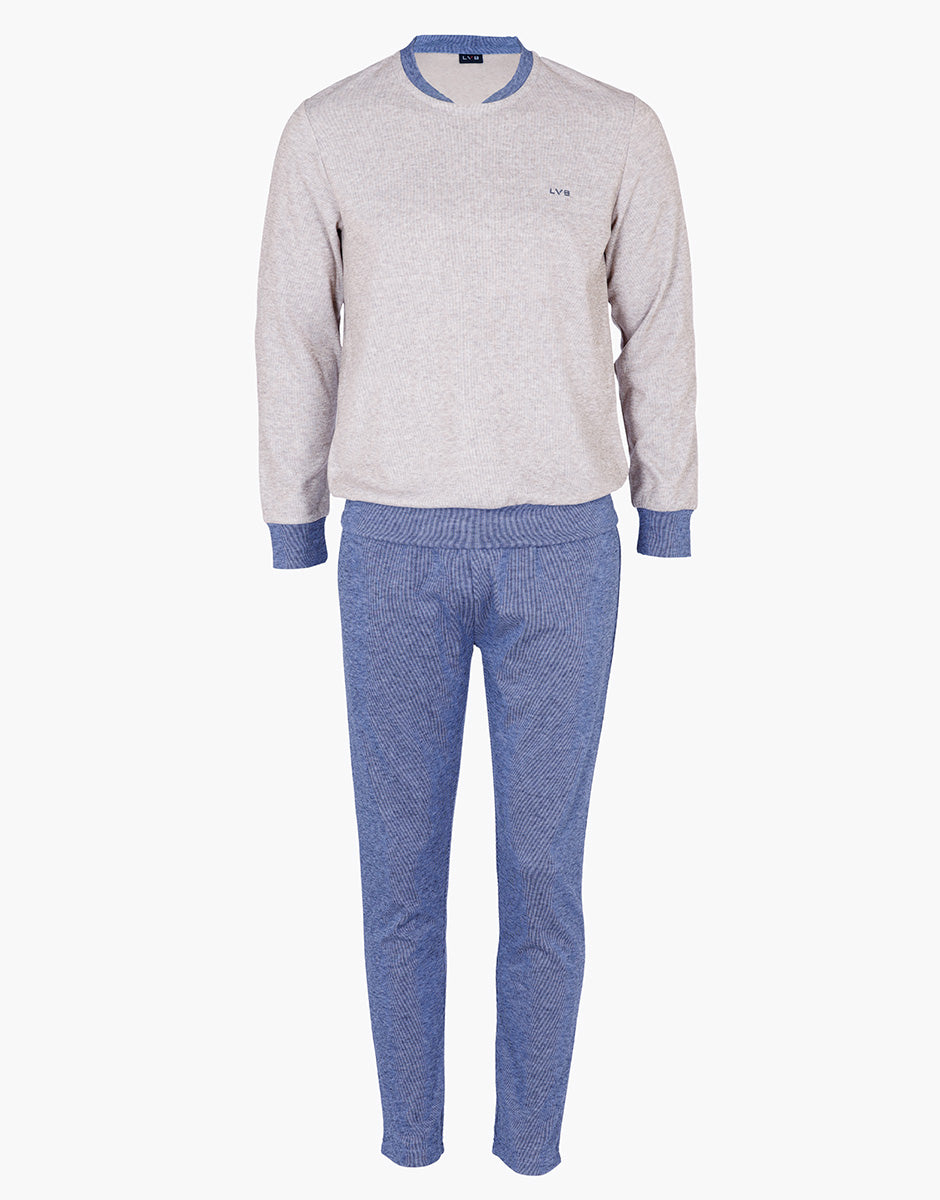 Scopri il nostro pigiama lungo da uomo in interlock caldo e morbido, color beige melange con dettagli azzurro melange. Realizzato in un tessuto tecnico che unisce poliamide, viscosa ed elastan, garantisce elasticità, calore e traspirabilità per un comfort eccezionale durante le tue serate di relax.