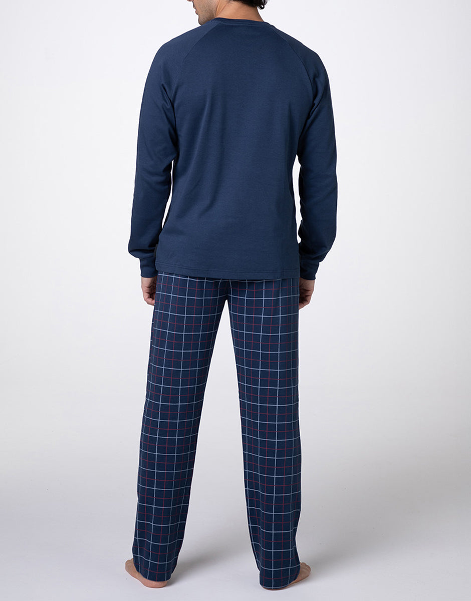 Scopri il comfort del pigiama lungo uomo in cotone interlock, ideale per accompagnarti nelle stagioni più fresche. La casacca tinta unita blu navy è valorizzata da un carrè frontale tono su tono e polsini coordinati, mentre la tasca patch stampata sul petto riprende la fantasia del pantalone per un look armonioso e curato.