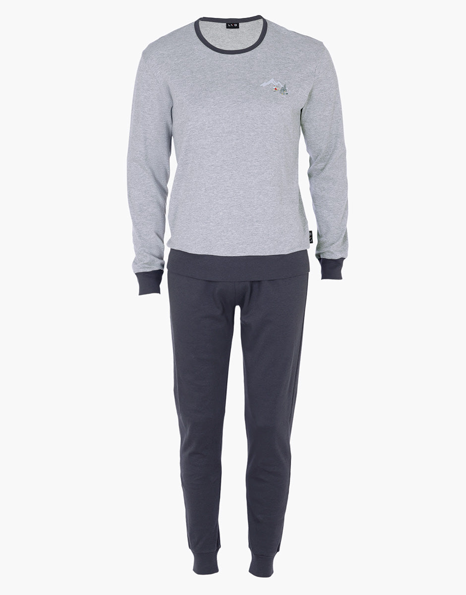 Rilassati con comodità con questo pigiama lungo da uomo in morbido interlock, ideale per serate e notti all’insegna del relax. La casacca in grigio melange chiaro presenta un girocollo semplice e confortevole, con bordature a contrasto grigio scuro su collo, polsini e fondo, mentre la stampa montagna sul petto aggiunge un tocco casual e moderno.
