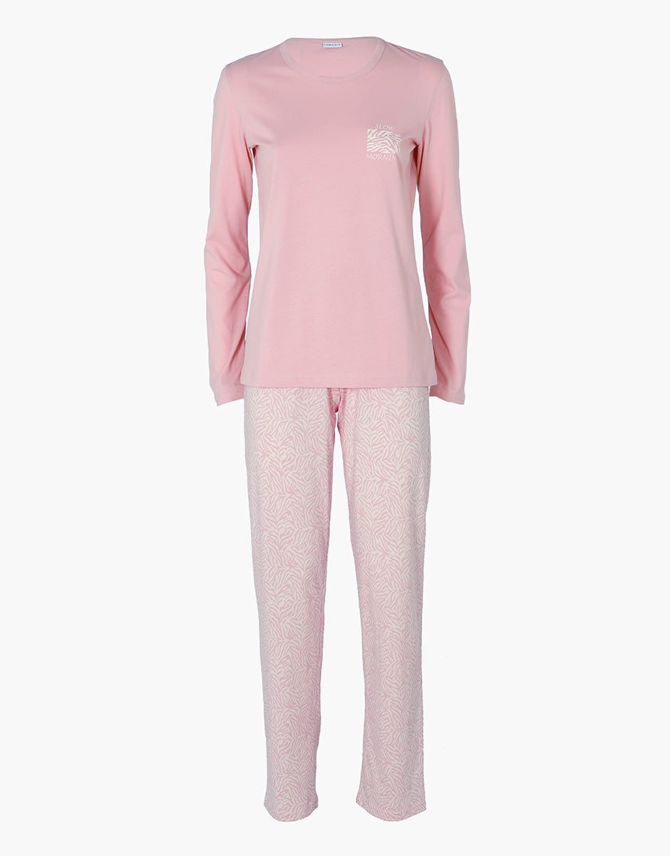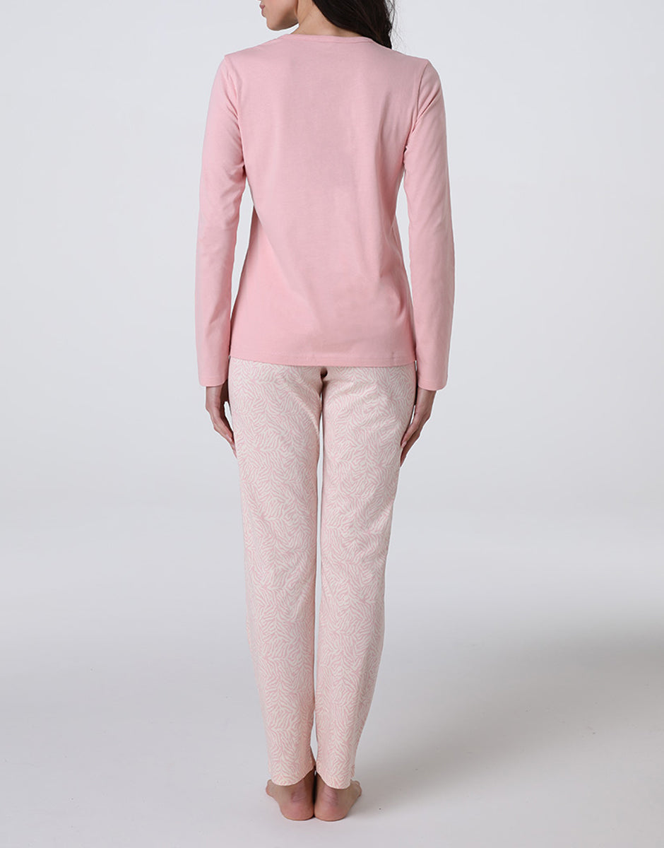 Un pigiama lungo in jersey di cotone, morbido e confortevole, pensato per accompagnarti nei momenti di relax. La casacca rosa vintage, dal taglio semplice con girocollo, è arricchita da una stampa piazzata laterale sul petto, mentre il pantalone rosa chiaro presenta una stampa allover tono su tono che crea un abbinamento armonioso.