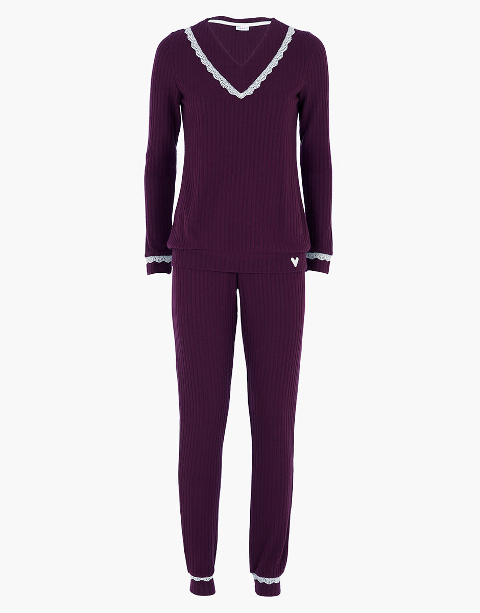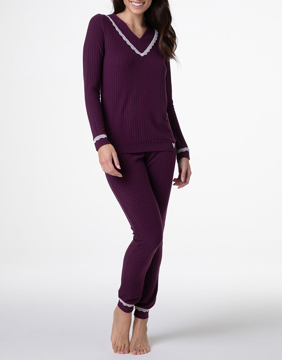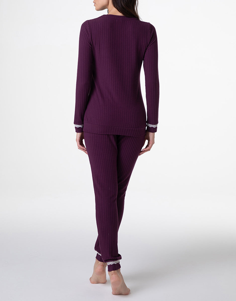 Un pigiama lungo da donna elegante e confortevole, pensato per regalarti calore e morbidezza durante le notti più fresche. Realizzato in morbido tessuto a costine, leggermente garzato esternamente, avvolge delicatamente la silhouette e offre una piacevole sensazione di comfort. Il colore vinaccia aggiunge calore e femminilità.