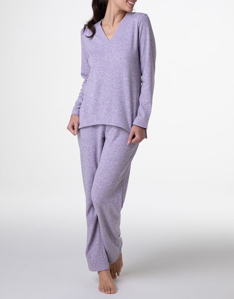 Pigiama Lungo scollo a V in Interlock garzato, rosa orchidea