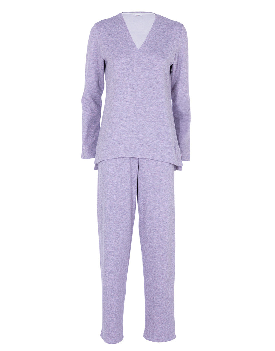 La casacca presenta uno scollo a V, una linea leggermente stondata e più corta sul fronte, con spacchetti laterali che garantiscono libertà di movimento. Il pantalone lungo completa il capo, combinando stile, morbidezza e femminilità in un unico pigiama avvolgente.