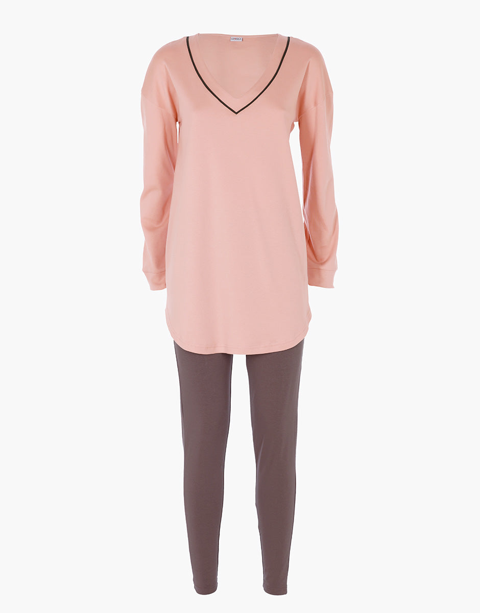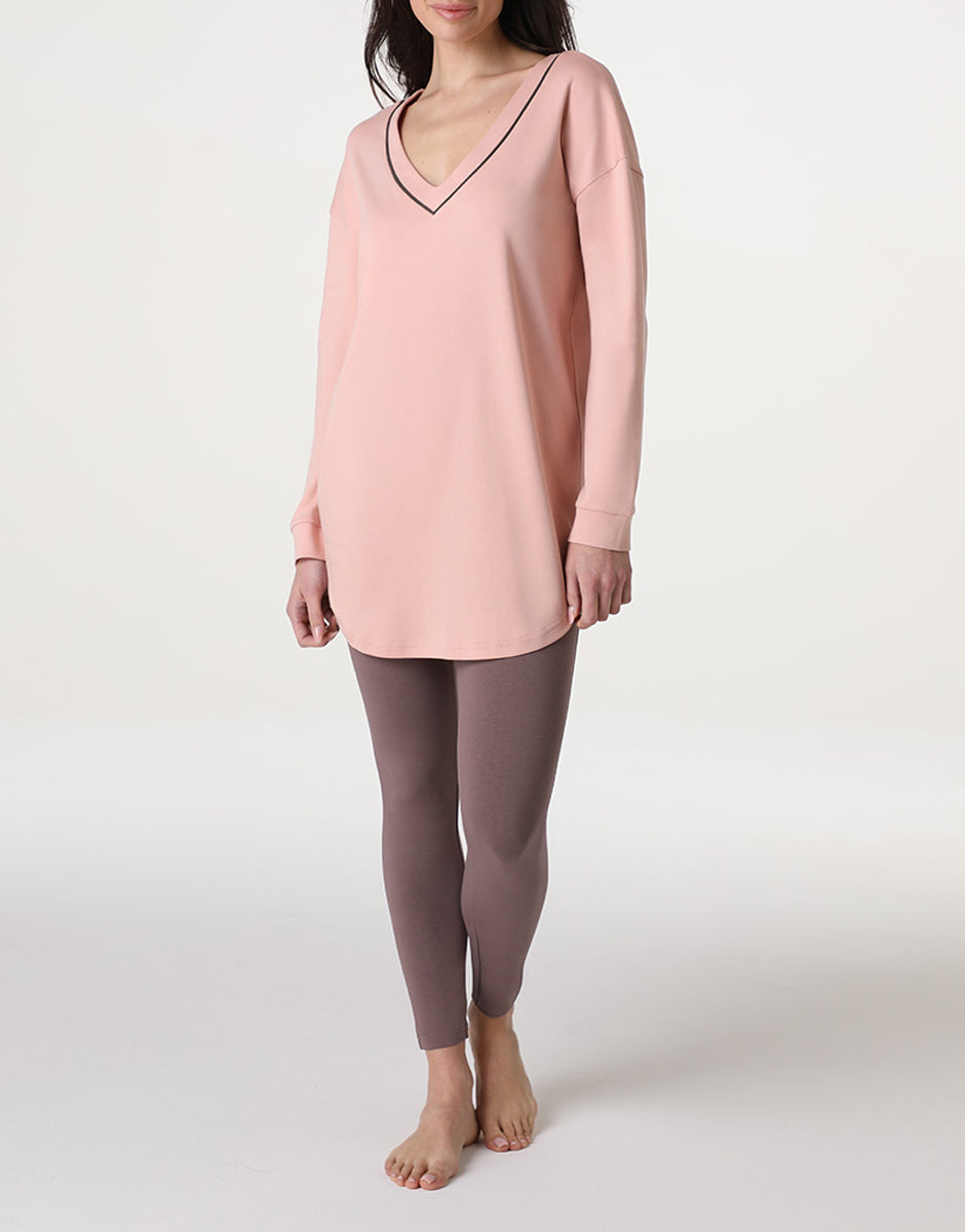 Un pigiama lungo da donna pensato per offrire comfort, morbidezza e praticità durante il relax a casa. La casacca over in interlock rosa blush presenta spalle scese, uno scollo a V con piping a contrasto e polsini sul fondo manica, per un capo femminile e curato nei dettagli. Il fondo stondato sul davanti e sul retro completa il design elegante e moderno.