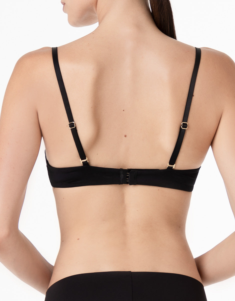 La microfibra in filato ultra-fine lucido avvolge la pelle con una mano morbida e una superficie liscia, contribuendo all’effetto invisibile sotto gli abiti. Le spalline completamente regolabili possono essere incrociate sulla schiena, per adattare la vestibilità a diverse esigenze di indosso. Le ali posteriori doppiate accompagnano la struttura sul retro. I dettagli in metallo dorato completano il design semplice della linea Invisible Breeze.