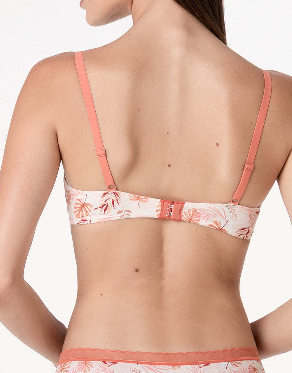 Le coppe preformate doppiate accompagnano il seno con naturalezza, mentre la lunetta interna laterale contribuisce a migliorare la vestibilità, offrendo un supporto leggero e confortevole.