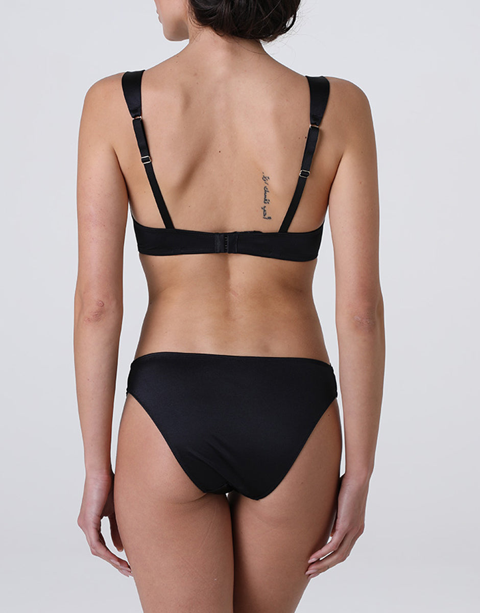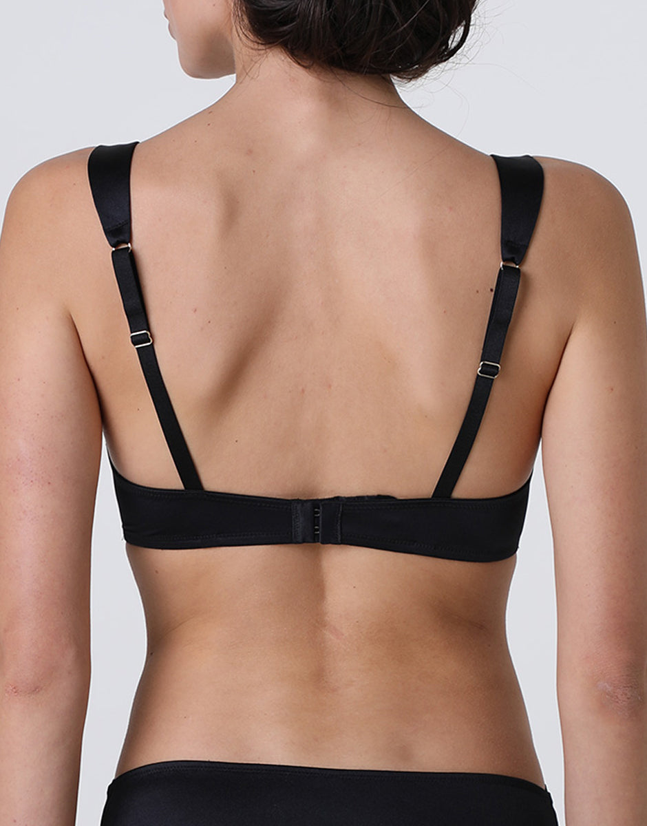 Il design è arricchito da un gioiello dorato posizionato sull’apice alto, che dona un tocco prezioso e distintivo al capo. Le spalline larghe in raso conferiscono un comfort superiore e completano l’estetica elegante, mentre la fascia sotto al seno, in microfibra satinata sia sul davanti che sul retro, assicura una vestibilità stabile e confortevole.