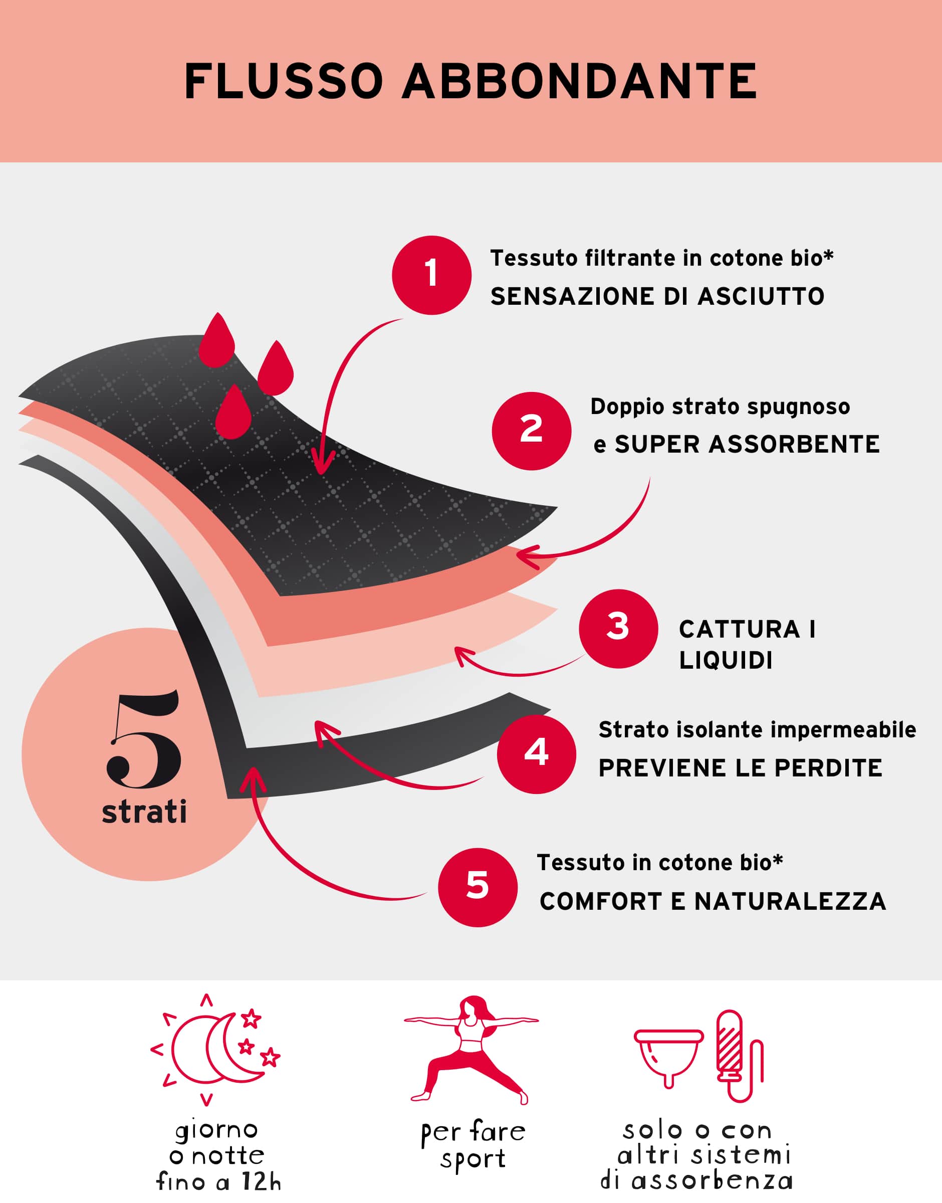 Progettati con una vestibilità ottimale, combinano discrezione e stile, garantendo comfort e sicurezza anche nei giorni di flusso più intenso grazie ai materiali di alta qualità come il cotone organico certificato Oeko-Tex ed Organic 100.