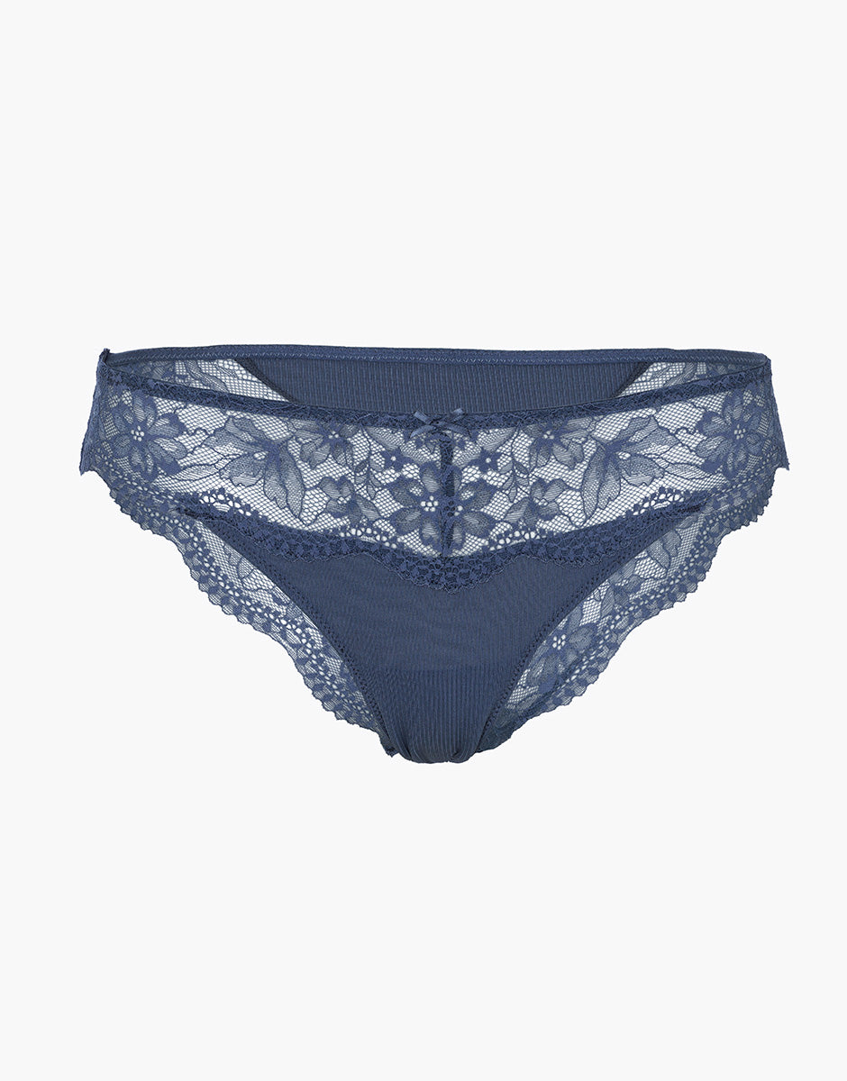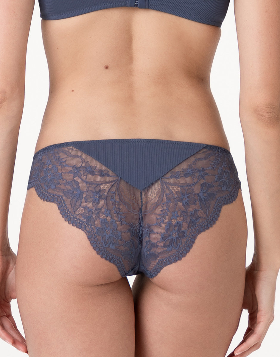 Lo slip della linea Casual Rib Lace in blu polvere è pensato per offrire comfort, femminilità e uno stile naturale, ideale da indossare ogni giorno. Il fronte in microfibra a costina avvolge la pelle con morbidezza, seguendo le forme in modo delicato e garantendo una vestibilità confortevole.