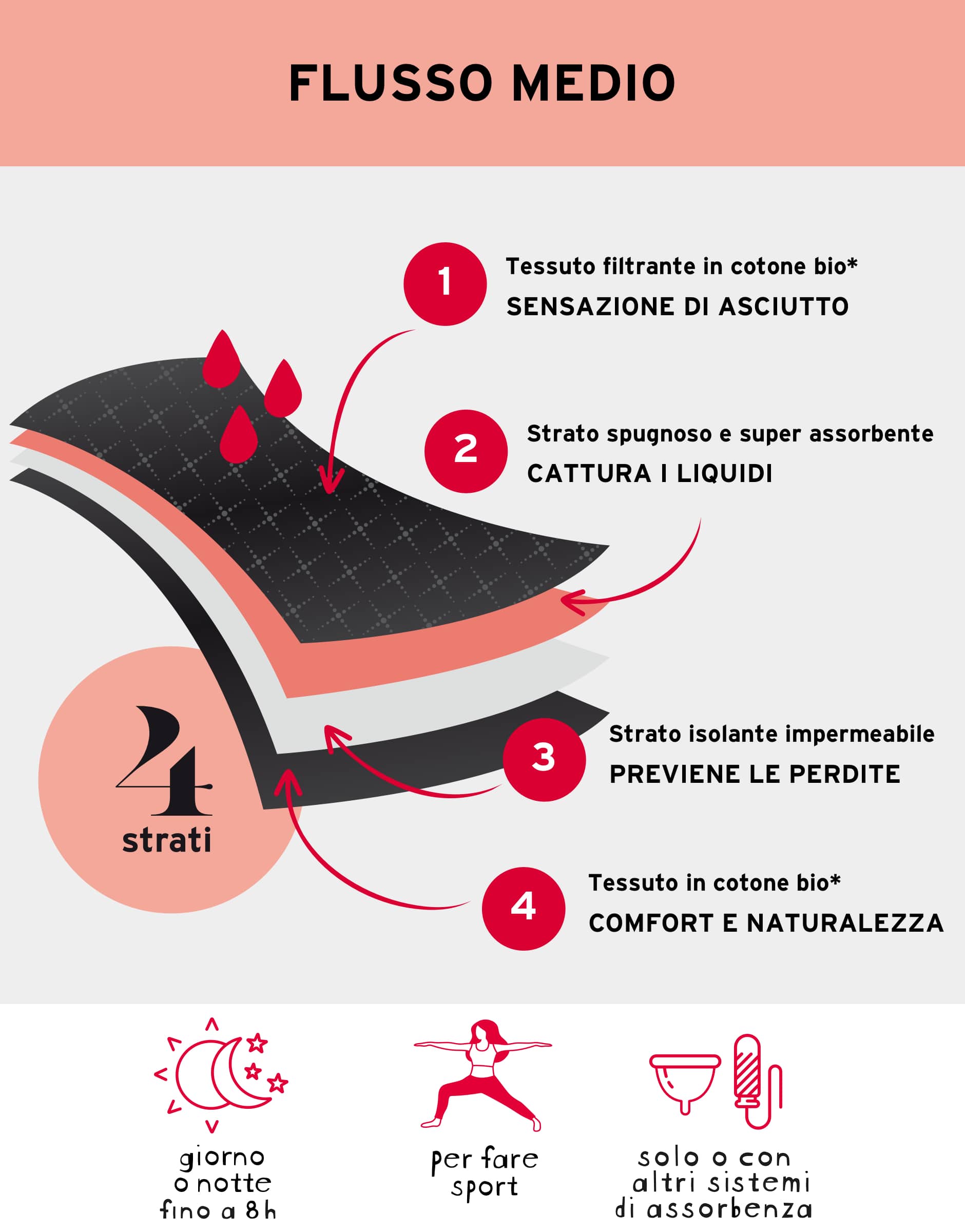 I quattro livelli di assorbenza garantiscono una protezione efficace fino a 11 ml di flusso. Il tessuto principale è composto al 95% da cotone biologico, assicurando morbidezza e traspirabilità, mentre il restante 5% è costituito da elastan per una maggiore elasticità e adattabilità.