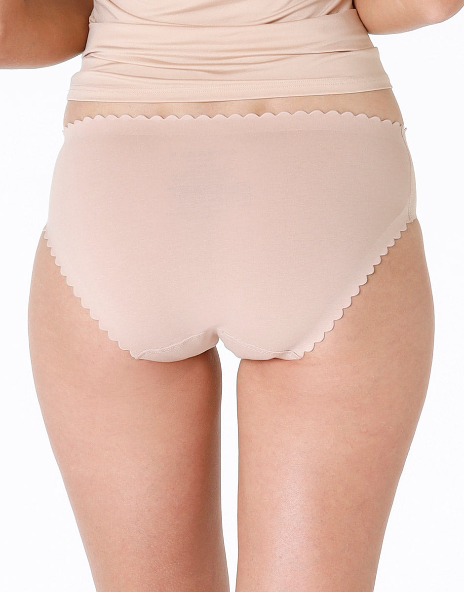 - Assenza di bordi elastici sul girovita e girogambe con finitura taglio a vivo e rinforzo adesivato. Motivo festonato su girovita e sgambatura posteriore