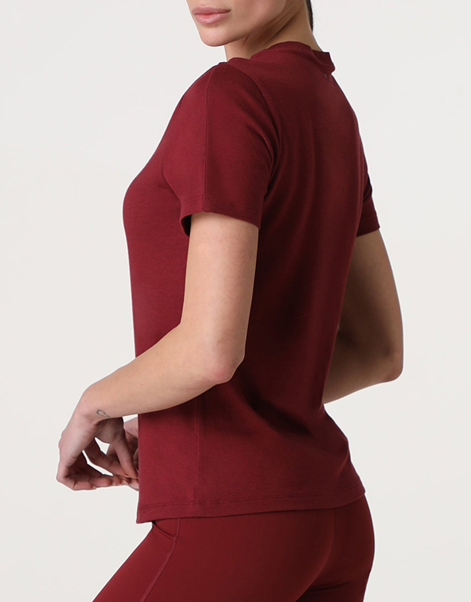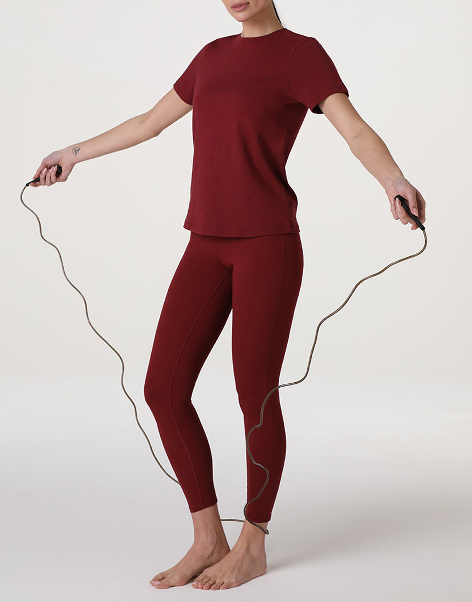 Il tessuto tecnico termoregolante mantiene la pelle fresca e asciutta, mentre il colore bordeaux aggiunge un tocco caldo e deciso al tuo look sportivo.