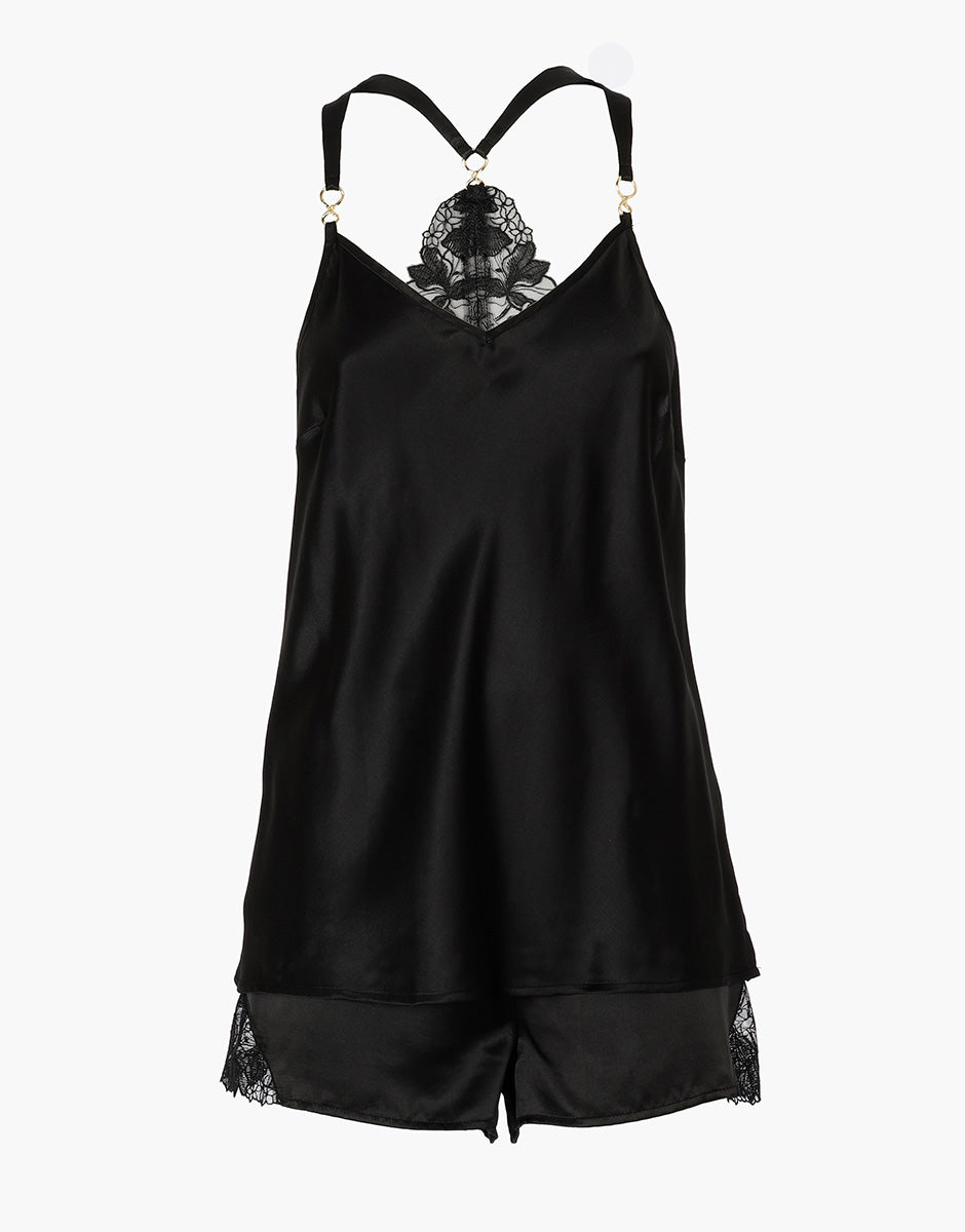 Il top ha una linea essenziale arricchita da dettagli ricercati: le spalline sottili sono decorate con accessori metallici sia sul davanti che sulla schiena, mentre un inserto in pizzo sulla schiena aggiunge un tocco raffinato e sensuale. Il pantaloncino, morbido e leggero, presenta una fascia in vita liscia sul fronte e arricciata sul retro, pensata per garantire una vestibilità armoniosa. Lo spacco laterale è impreziosito da un delicato inserto in pizzo tono su tono.