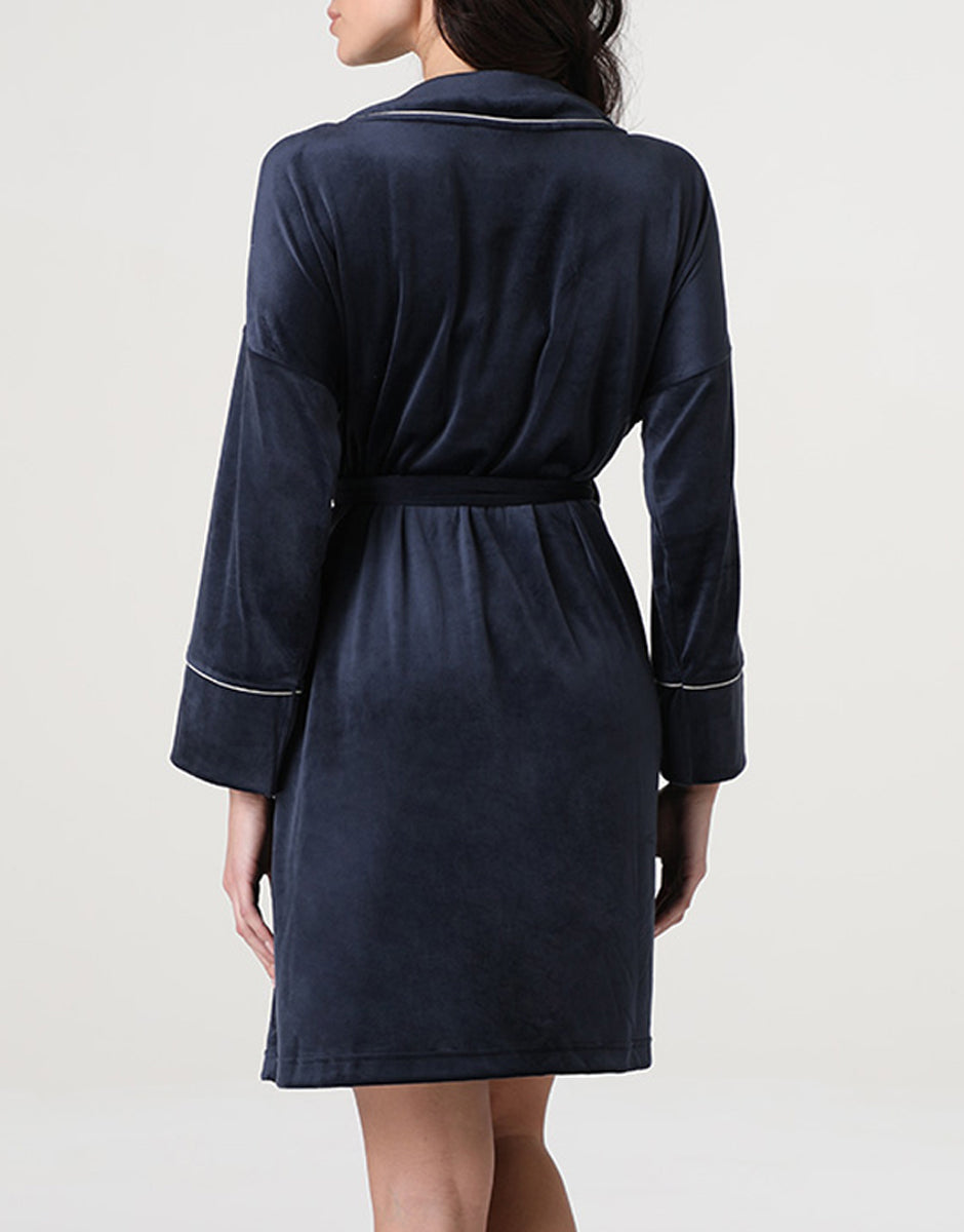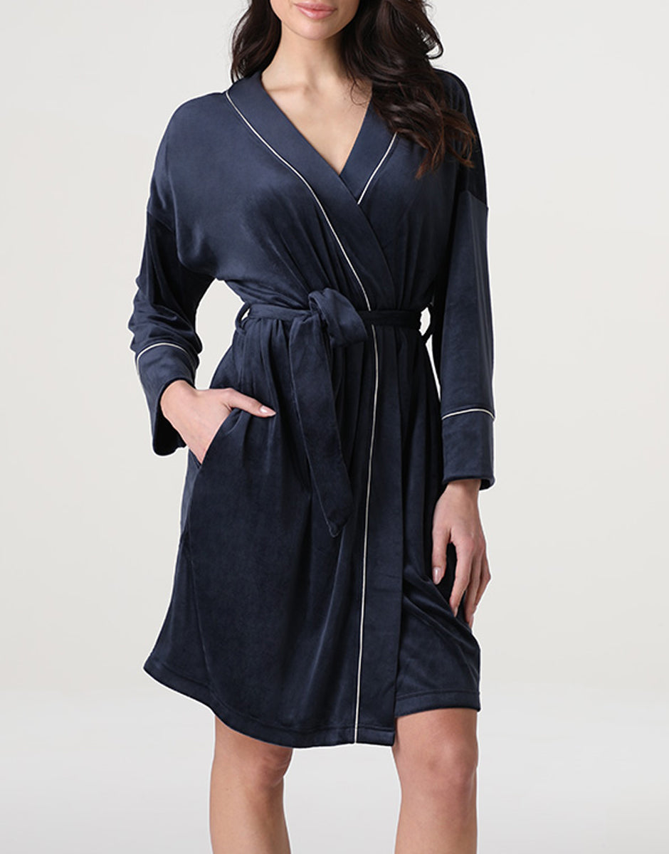 Il modello presenta piping a contrasto lungo i profili, cintura removibile che valorizza la silhouette e pratiche tasche a filetto, per unire funzionalità e femminilità in un unico capo. La vestibilità morbida e la texture soffice della ciniglia la rendono un capo ideale da indossare sopra il pigiama o l’homewear preferito.
